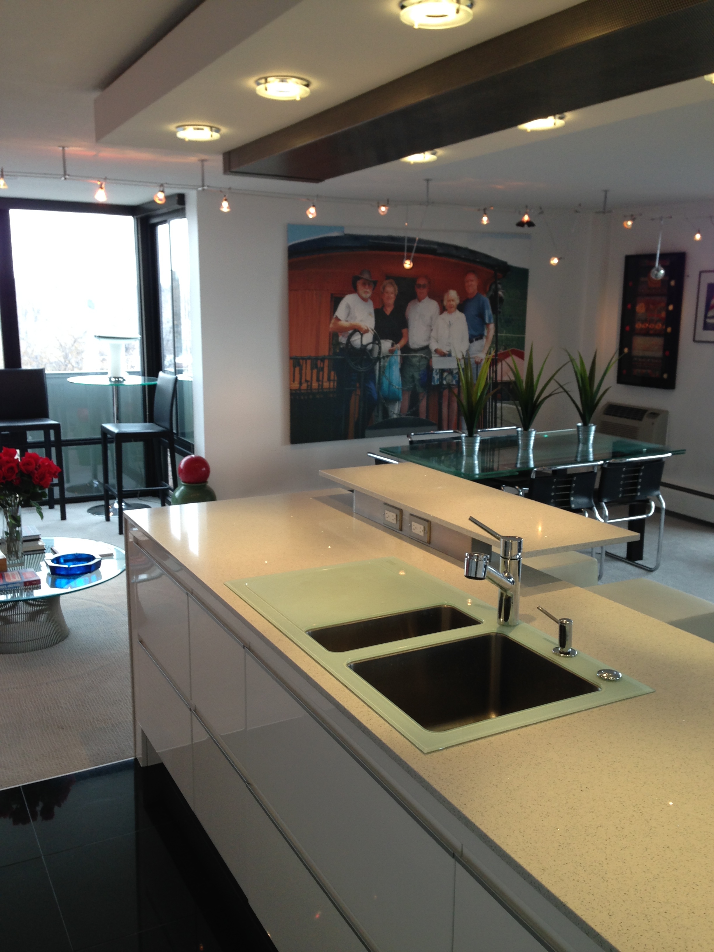 The renovation of the small 8′x 9′ space opened the kitchen up dramatically by removing non-structural walls, eliminating all of the upper cabinets, and creating a wide island with bar seating and a sleek contemporary work space, all of which helped provide direct visual access to the living room, the repositioned dining area, and the rest of the apartment. The kitchen is now open, bright, and cheery with lots of natural light and expanded views of Pikes Peak and surrounding neighborhoods. The contemporary design elements of the kitchen includes quartz countertops, black granite tile (extended in from the adjacent Entry Hall), glass tile backsplash, european cabinets, a Thermadore 24′ column refrigerator, an 18-inch Bosch dishwasher, a Miele Speed Oven and Convection Cooktop, and a Franke glass-surrounded stainless steel double sink. A bold wall of red provides a splash of color that extends into the sitting area, and a strip of blue neon livens up the space for those special parties. The kitchen island, which includes