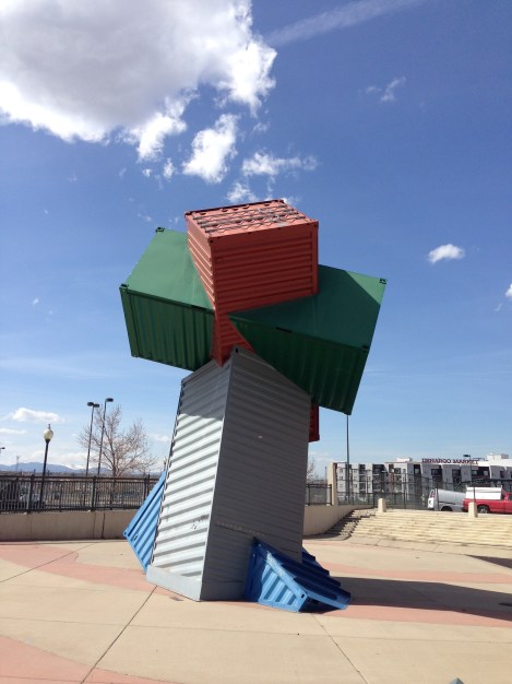 PUBLIC ART – DENVER, COLORADO Two examples of another creative use of shipping containers can be seen in part of Denver’s transitioning industrial area adjacent to the Central Business District. Once strictly a gritting industrial zone that included rail storage yards, large brick warehouses, distribution facilities and other similar types of businesses, the area is being transformed into a redevelopment area that includes not only the reuse of industrial buildings to office, residential, and retail (including the 25th and Larimer project just reviewed), but also new construction of apartments and condominiums. The City commissioned two art pieces made from shipping containers, both of which serve as a “gateway” into the area, visually invoking the historical industrial nature of the area.
