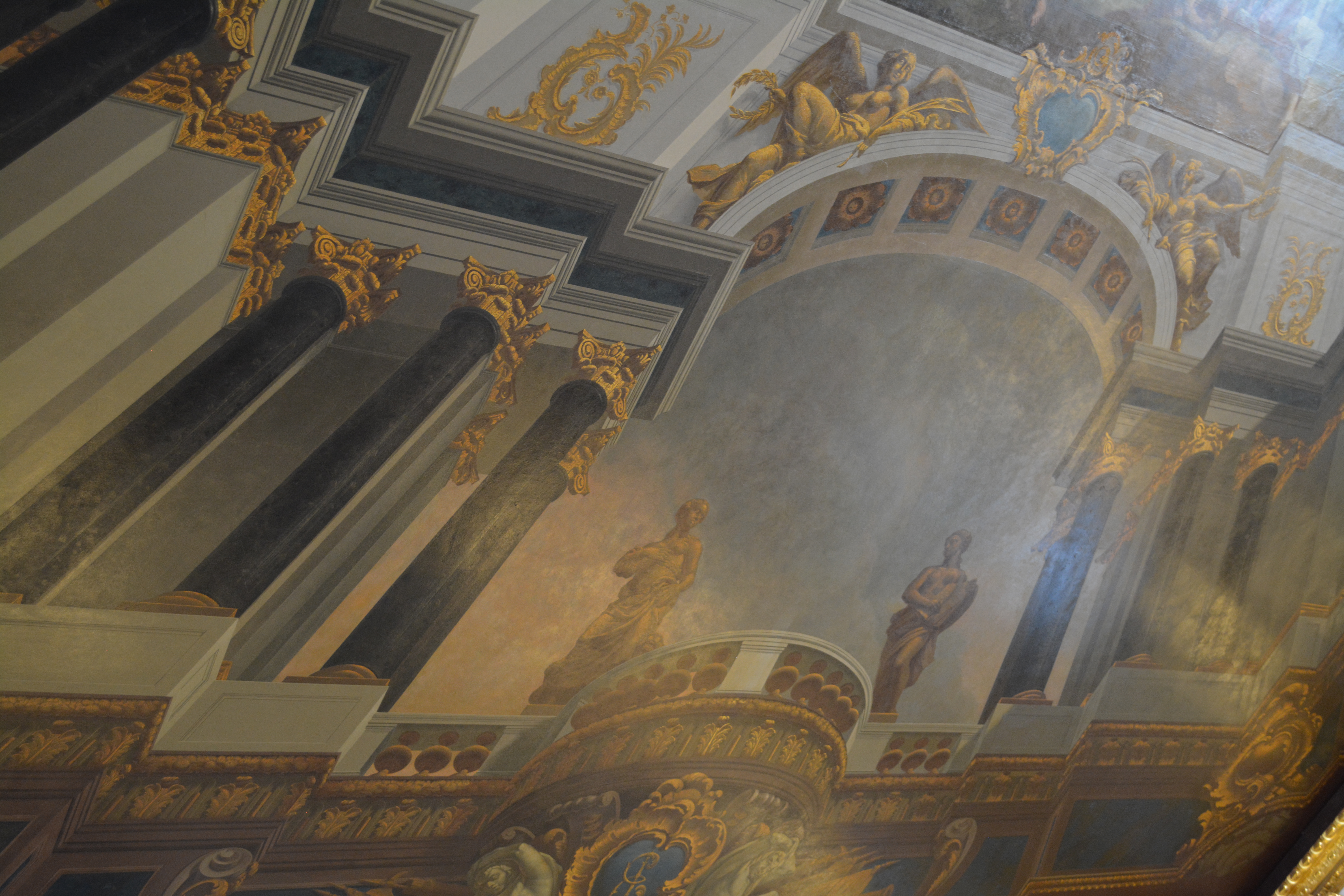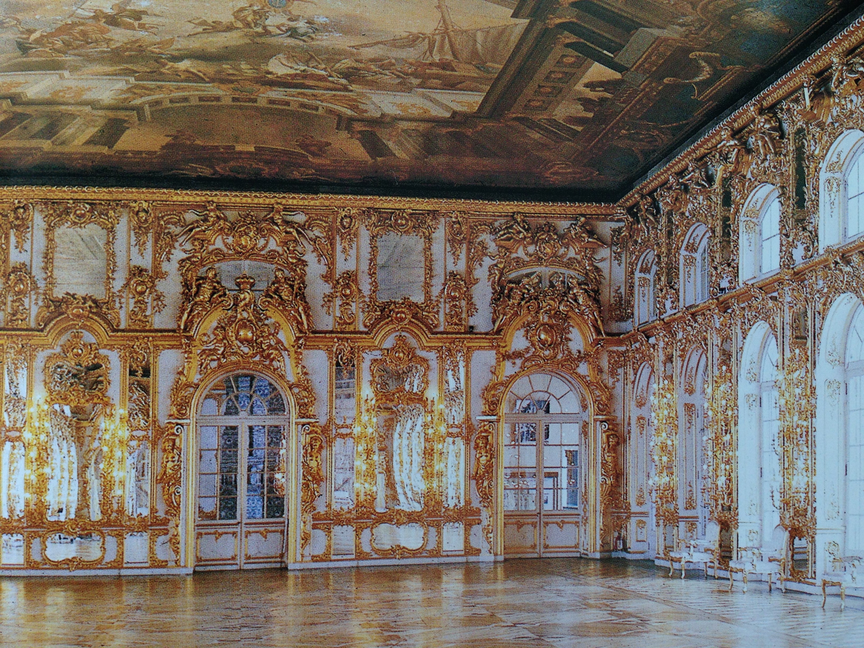 Besides staterooms, drawing rooms and living quarters, architect Rastrelli incorporated a chapel into his design, which became known as the Church of the Resurrection, located in the east wing of the building. And, he was not only the architect, but the interior designer of the Palace as well, best judged by the decor of the Grand Hall, an enormous room that measures over 9,100 square feet. This bright and airy reception Hall exudes greatness and majesty, with its many mirrors, the abundance of gilding and, in particular the spectacular painted ceiling.