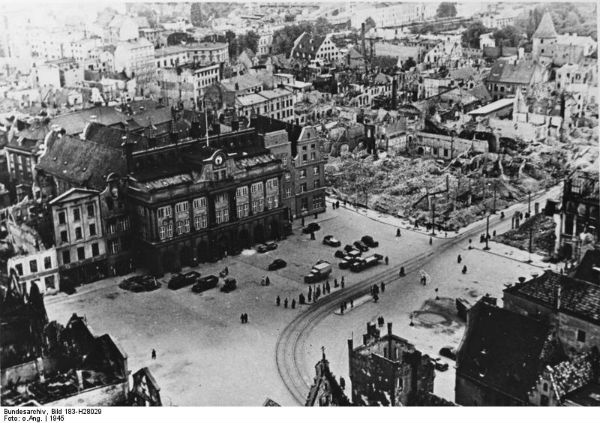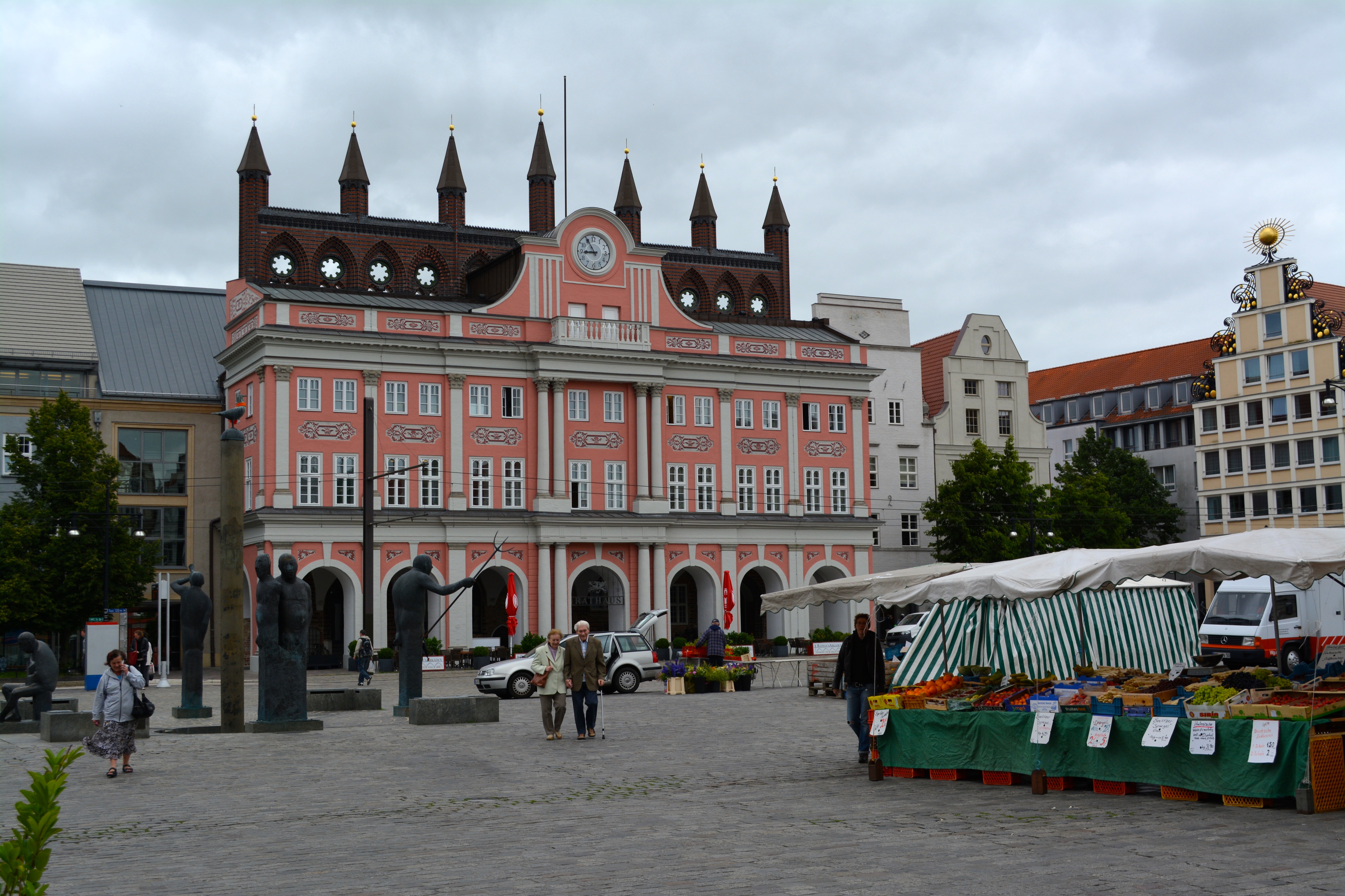 The Rostock City Hall or Rathaus is located in the historic New Market Square, reconstructed in 1952 after the bombing it suffered during WWII. The Town Hall looks more like a hotel than a public administration building. It has a pink, Baroque facade, which was added over the original Gothic architecture during its construction between 1270 – 1290. In its original life, not only was it a Town Hall but it also served as a trading center. Another addition during the late 15th century gave it the additional function as a Festival Hall. I found this photograph of the same area taken after the Allied bombing; like other cities throughout Europe, reconstruction of these historic cities has been remarkable.