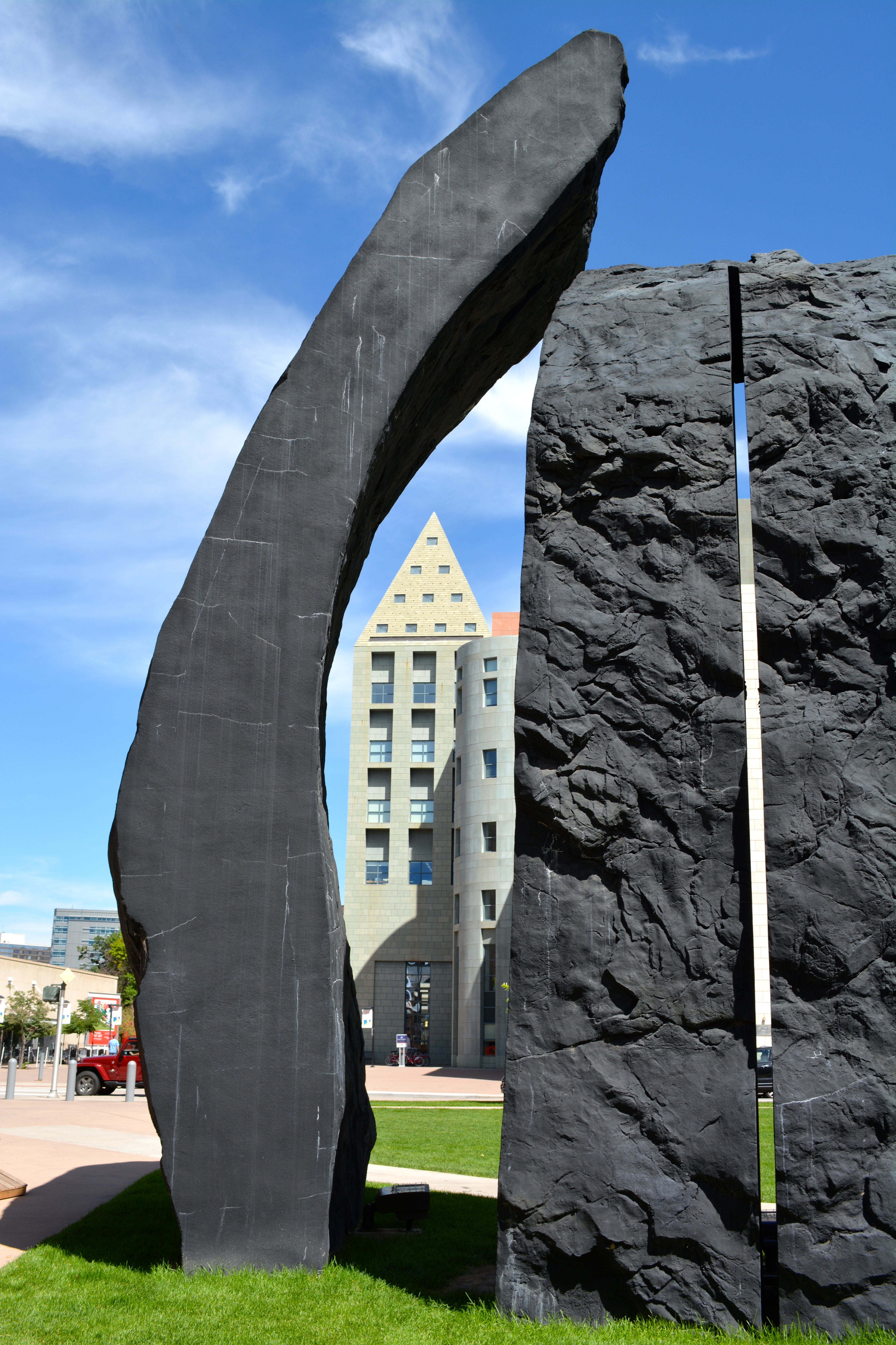 Denver Monoliths was created by sculptor Beverly Pepper, commissioned by the Denver Art Museum for display in front of the Frederic C. Hamilton Building. The two sculptures making up the artwork, one 42’ tall and one 31.5’ tall, were made using “artificial rock” concrete construction methods like those used for naturalistic concrete environments in zoos, botanic gardens, and amusement parks; the two pieces together weigh 155,000 pounds. The primitive forms in charcoal-gray concrete provide a stark contrast to the futuristic zigzags of Daniel Libeskind’s shimmering silver building.