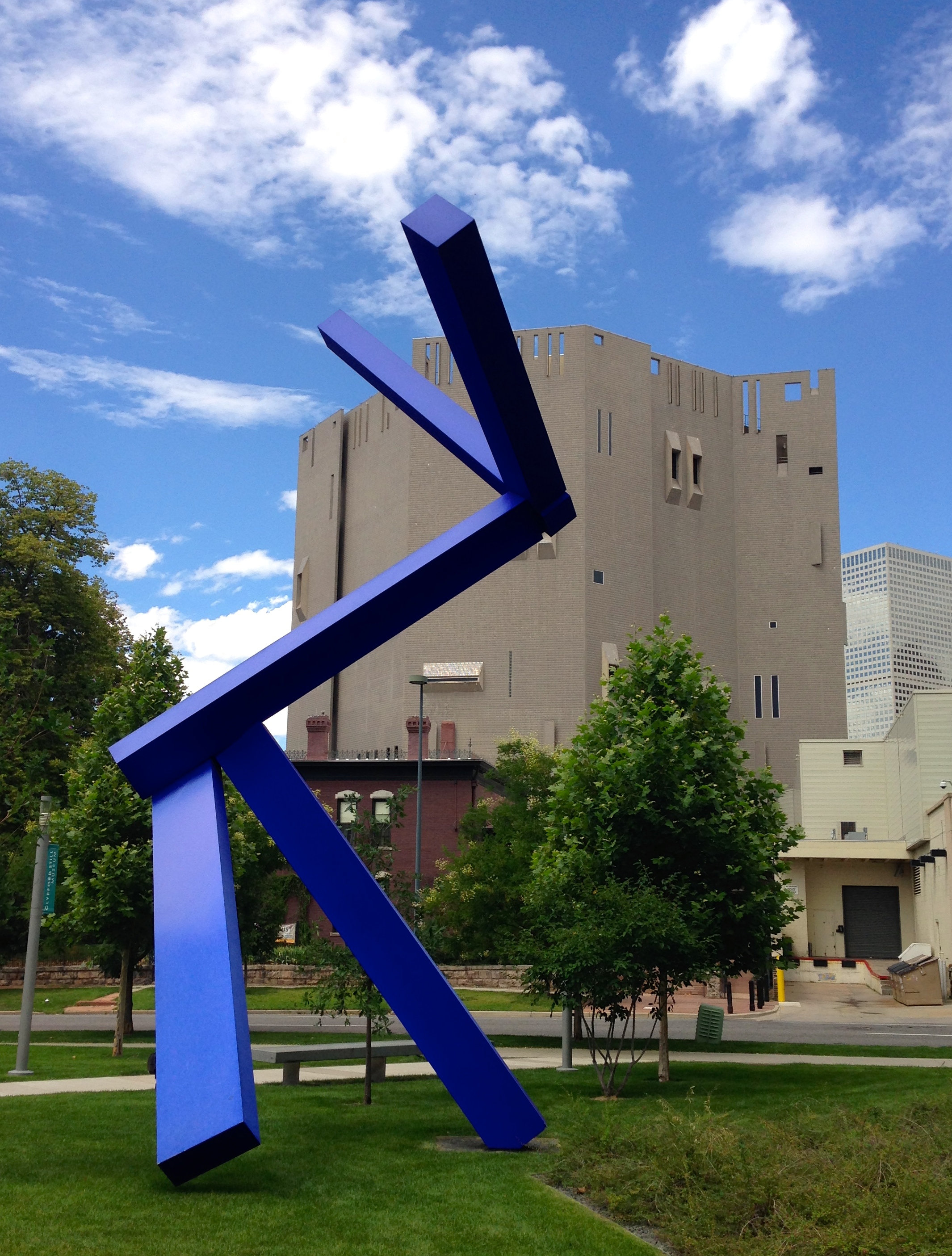 For Jennifer is a simple, yet bold abstract sculpture that adorns the tree-dotted plaza between the Clyfford Still Museum and the Hamilton Building. The bright blue 32-foot tall aluminum sculpture was designed by Joel Shapiro, an American sculptor renowned for his dynamic work composed of simple rectangular shapes.