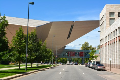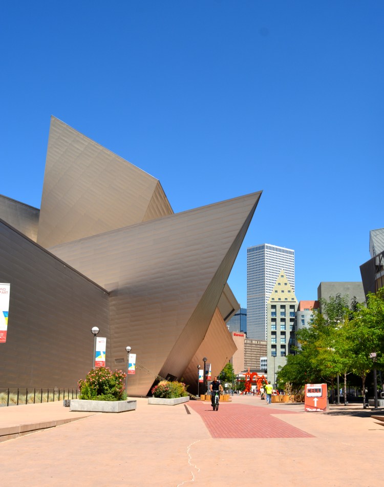 When the museum needed to expand, a separate building was commissioned that resulted in the development of the dramatic Frederic C. Hamilton Building, designed in 2006 by the international architectural firm of Studio Daniel Libeskind, partnered with the local architectural firm of the Davis Partnership. The building appears as a titanium-clad explosion of shards, with a massive prow that stretches across West 13th Avenue toward the Ponti “fortress.” The metal panels and their coloration relate to the Ponti building’s rectangular glass tiles, and the scale is complementary. Laura Sydell, the Digital Culture Correspondent for NPR has written that “the new addition to the Denver Art Museum stands out from the more traditional boxy buildings around it. Its gray, titanium walls meet at odd angles and reflect back the light of the Colorado sky. It looks a bit like a piece of a distant mountain broke off and landed in downtown Denver.”