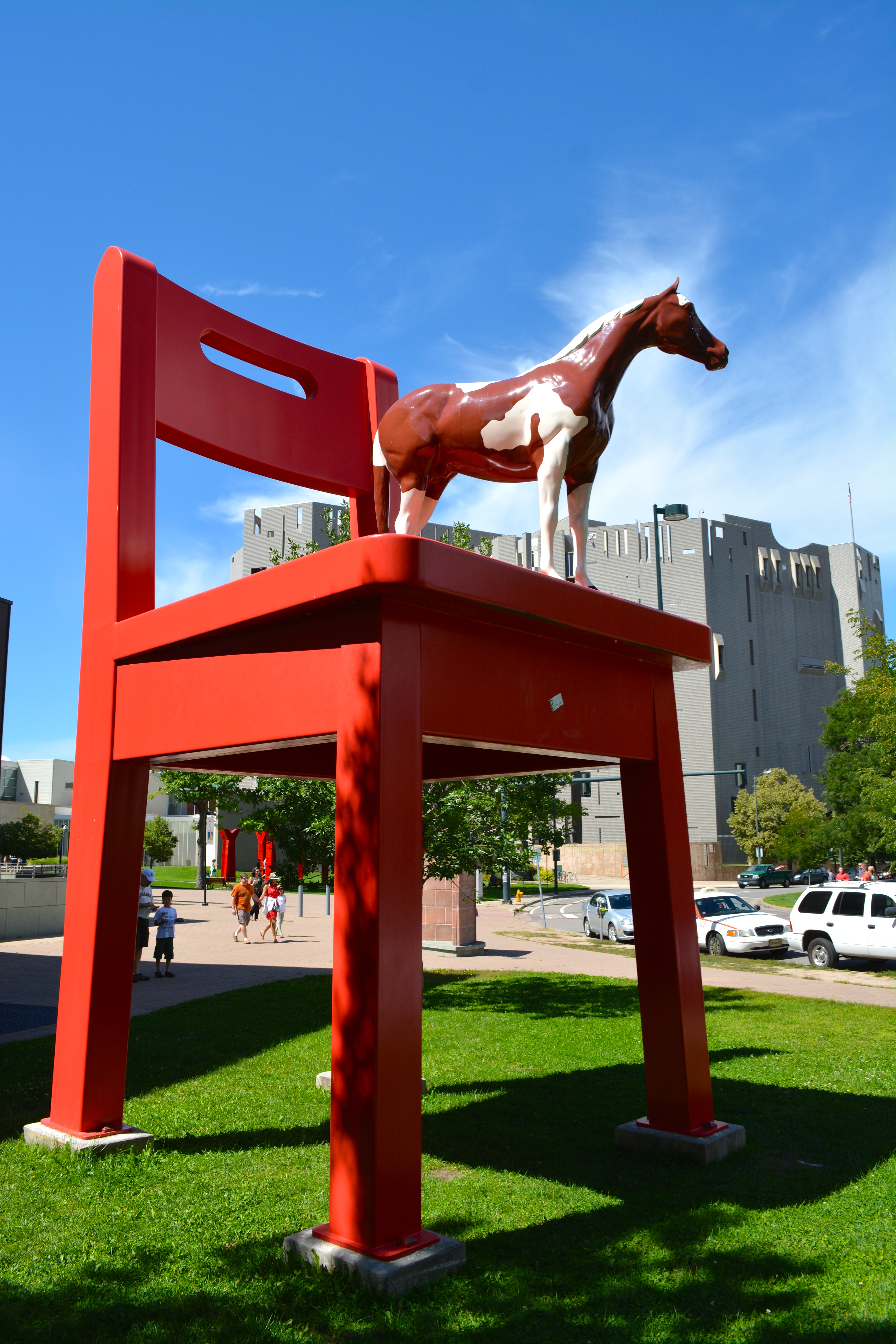 “The Yearling” was created by artist Donald Lipski. Located on the north side of the Denver Public Library in front of the Childrens’ Pavilion, the sculpture is made of steel and fiberglass. The bright red chair measures 21 feet tall and ten feet wide, and the pinto pony is six feet tall at the ears. The scale of this work is meant to recall that time in life when even everyday objects seemed monumental. The piece was originally commissioned for an elementary school in upper Manhattan. When the school district asked Lipski to omit the horse, he refused, saying, “It just lost all its magic.” The sculpture spent 1997 in New York City’s Central Park, where it was widely acclaimed before traveling to Denver in 1998 for permanent installation. For more information about the artist, go to: Donald Lipski.
