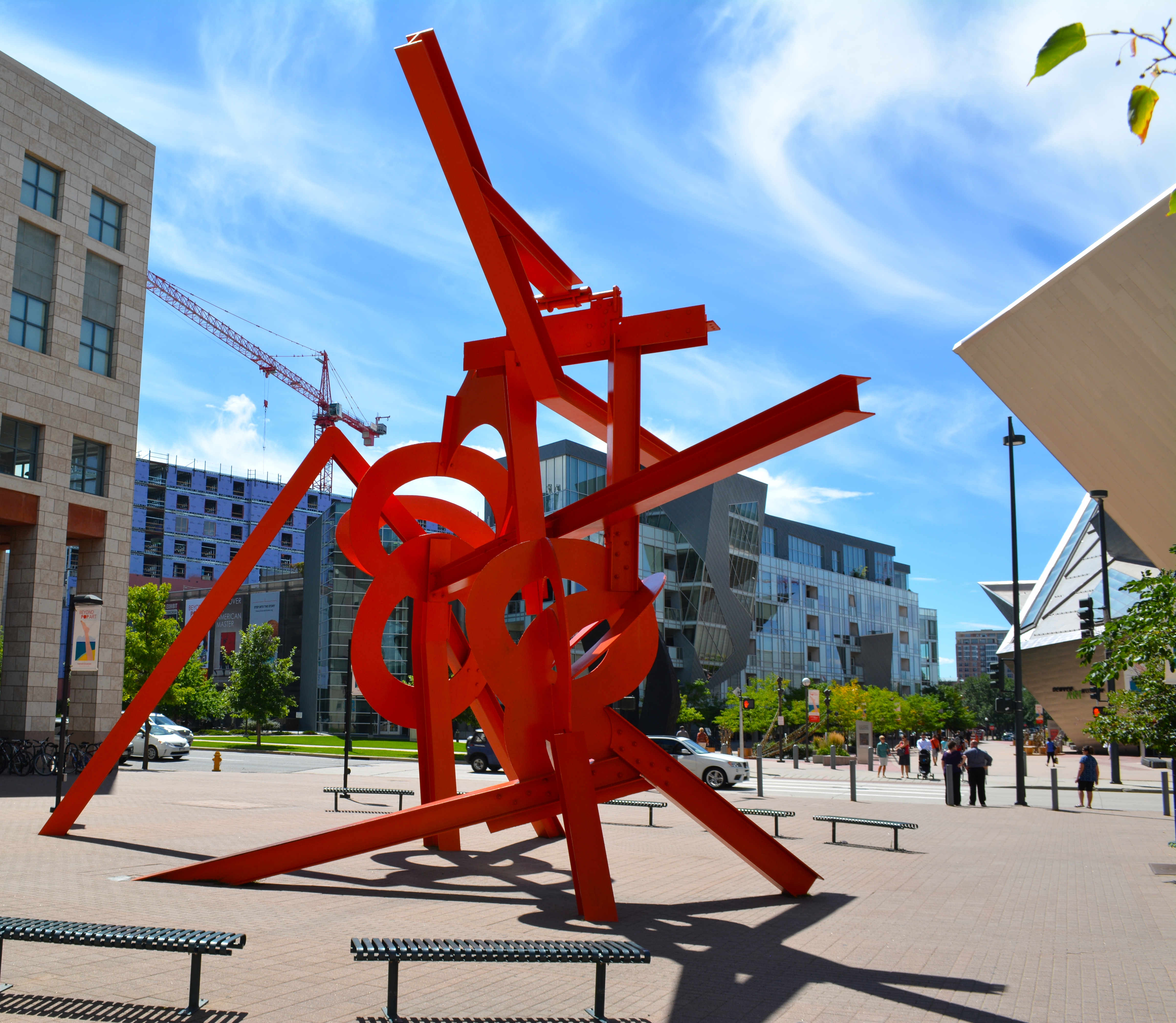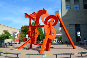 Lao-Tzu, a colorful Alexander Calder-like sculpture is located in the middle of the Acoma Plaza of the Arts, between the Denver Art Museum and the Denver Public Library. Designed by Mark di Suvero, it is probably one of the most viewed sculpture in the complex.