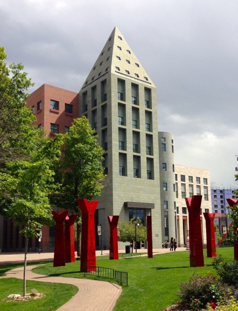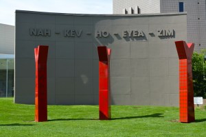 The Wheel, a multi-piece sculpture located outside the DAM’s North Building was created by Native American artist HOCK E AYE VI Edgar Heap of Birds, commissioned by the Denver Art Museum in 1996. Dedicated on June 21, 2005, the Wheel consists of ten red forked tree forms made of porcelain enameled panels on steel frames. Each “tree” is 12 feet high and positioned on a 50-foot diameter circle. Wheel is aligned to the summer solstice sunrise, with Trees One and Ten forming an opening to the east. Wheel specifically addresses the history of Indian peoples from Heap of Birds’ perspective as a Cheyenne/Arapaho artist, whose ancestors have a long and often painful history in the region, as well as from the multiple tribes who have lived in Colorado for centuries. The Cheyenne phrase “NAH-KEV-HO-EYEA-ZIM,” which is on the curved wall in the background, translates to “We are always returning back home again.”