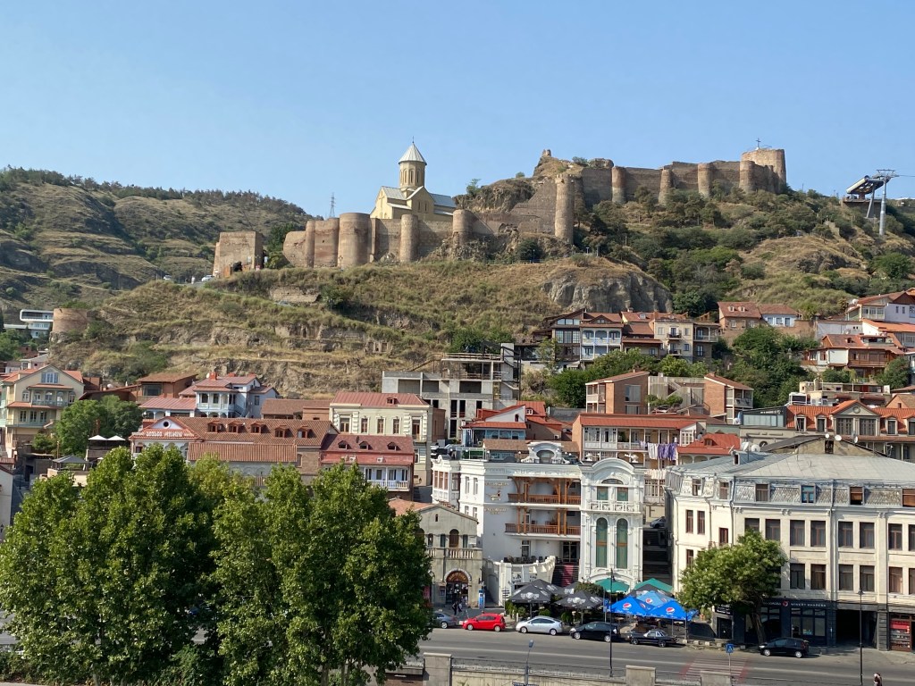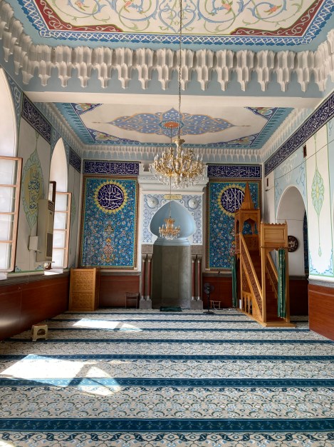 From the viewing area overlooking the Kura River, our guide pointed out the diverse religious communities that have historically lived together without conflict or prejudice: the Muslim district is now the location of the many thermal baths; the Armenian district is behind us on the hillside; and a mixure of Jewish, Christian and other communities are interspersed within the old town. An example of religious tolerance within the city is the joint use of the Tbilisi (Juma) Mosque, used by both the Sunni and Shiiite Muslims. This sharing of prayer rooms started in 1951 when a fire destroyed the Shiite Mosque; the Sunnis opened its Juma Mosque for Shiite prayers, first as a “divided” space but today is no longer divided and is open to all.