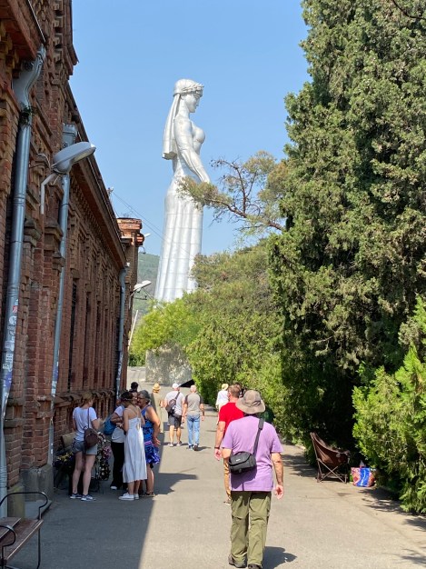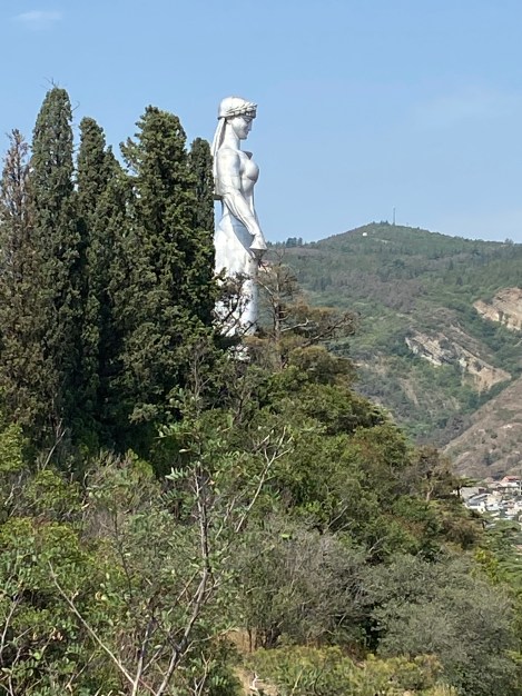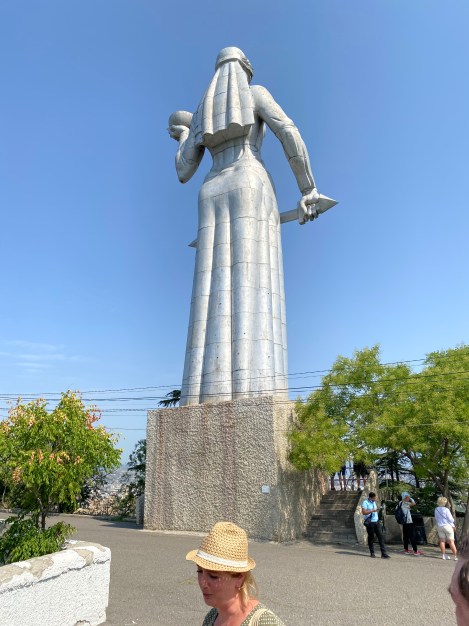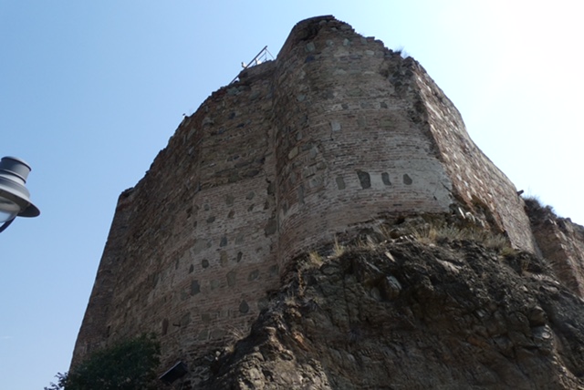 After visiting the Metekhi_Church, we walked over to the Gondolar for the short ride up to the top of Sololak Hill, where we could get a closer look at the gigantic Mother of Georgia statue and the Narikala Fortress. The statue was erected in 1958 to celebrate the city’s 1500th anniversary (that’s not a typo, folks!). The twenty meter high aluminum figure of a woman dressed in Georgian national dress symbolizes the Georgian national character; in her left hand she holds a bowl of wine to greet those who come as friends, and in her right hand is a sword for those who come as enemies – such an appropriate symbol for a country plagued by war over the centuries from its neighbors; and, its examples of religious tolerance throughout its history. While the statue overlooks the city, behind it and below in the valley is the Botanical Gardens, known not only for its collection of rare plants, but also for its cool, refreshing micro climate. From the statue we follow the paved trail down to the Narikala Fortress, built in the 4th century, around the period when the city was founded.