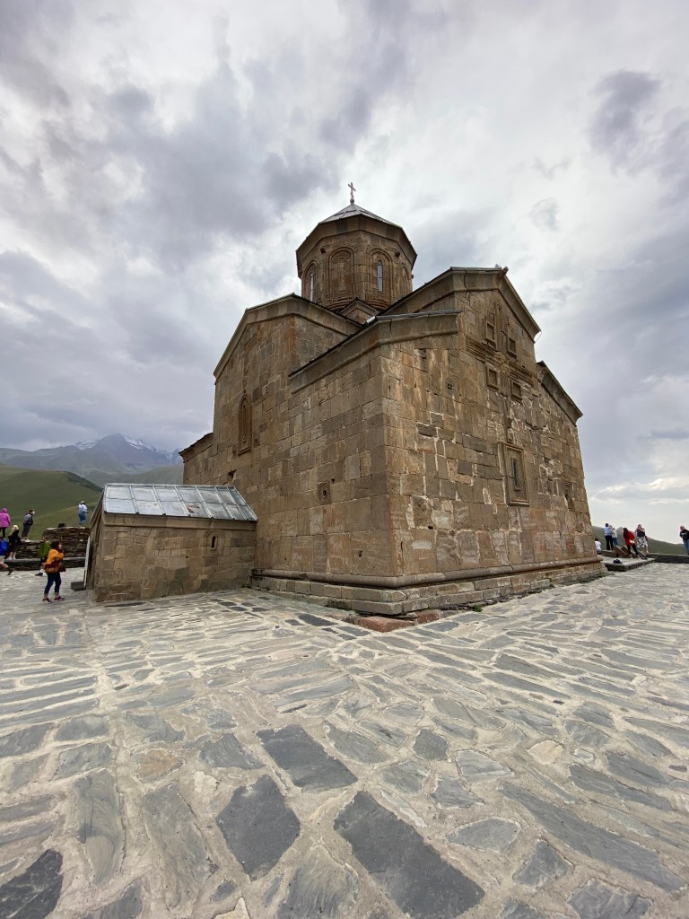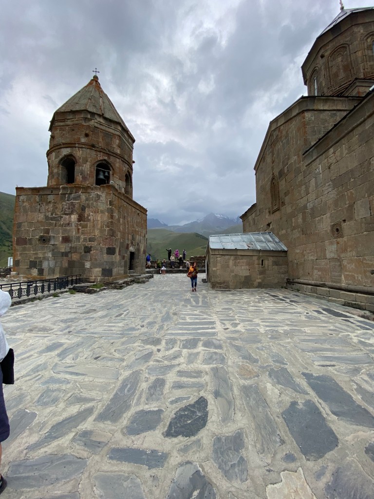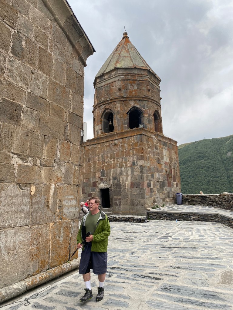 We hiked 1200 feet straight up to the Gergeti Trinity Church and had views below to the town and of Mount Kazbergi, a snow covered dormant volcano that towers to 16,512 feet. Although it was a sunny warm afternoon at the beginning of the hike, as we reached the church we encountered strong winds and driving rain.