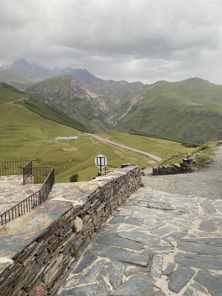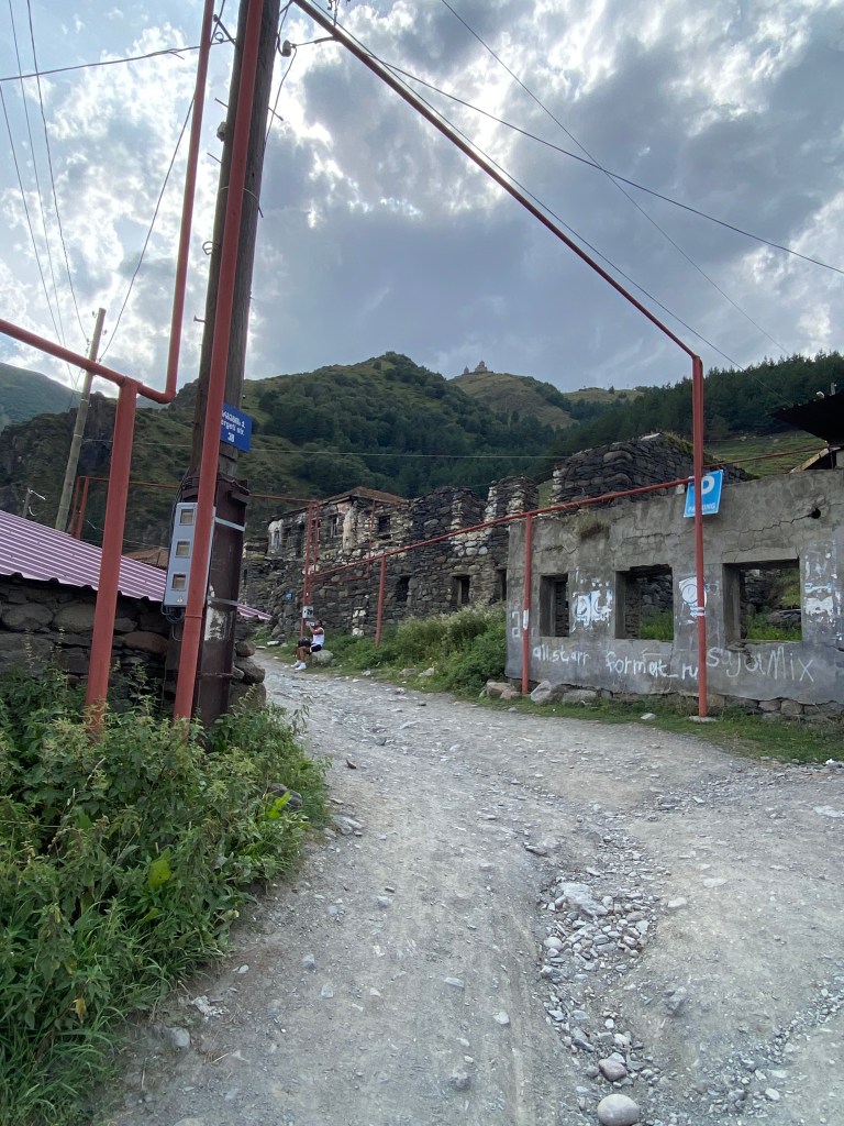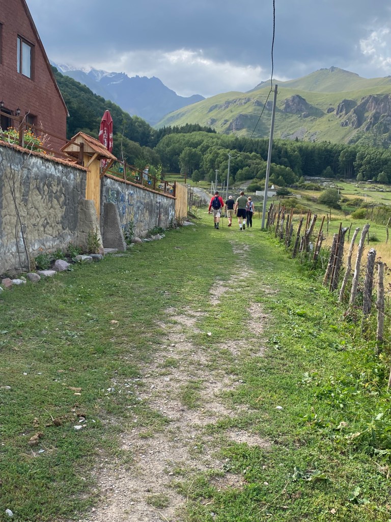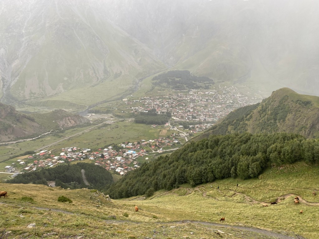 We continued driving along the Military Highway towards our final destination of Stepantsmida, a town of about 2000 residents. We passed two ski areas along the way, and although the highway was uncrowded and in good condition we didn’t arrive into the town until 4:30 in the afternoon. Once checked into the guest house, we drove back down into the town at the point we would begin our hike up to the church.