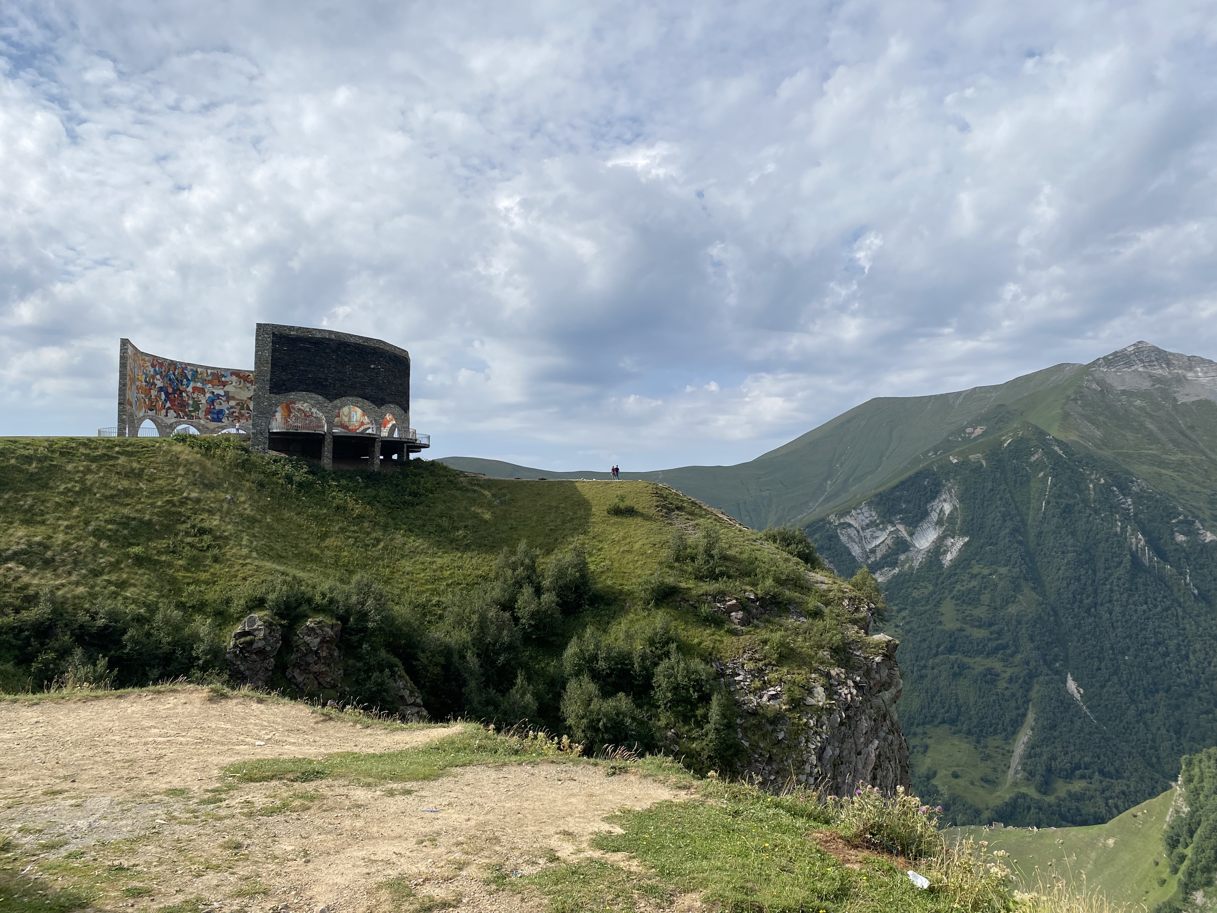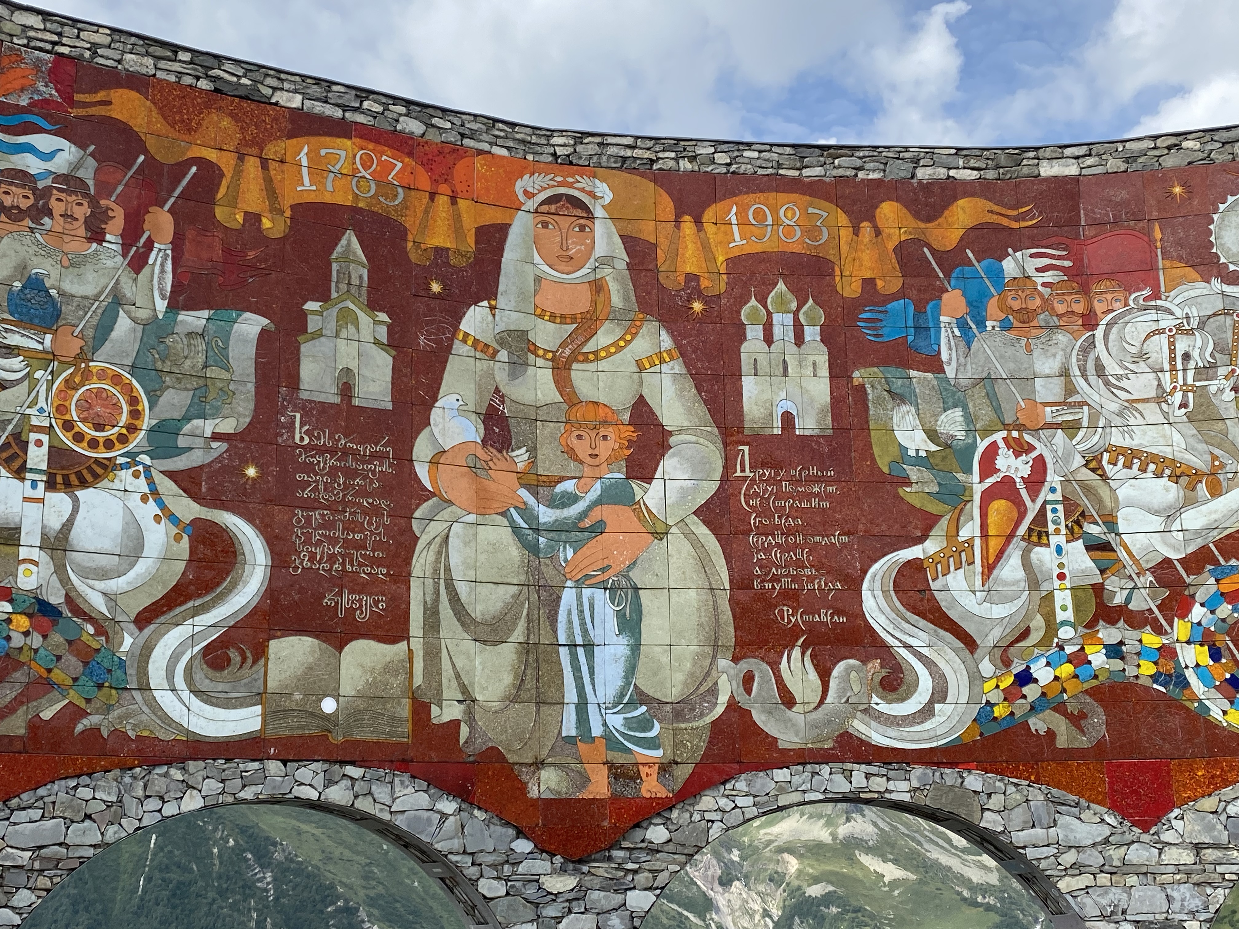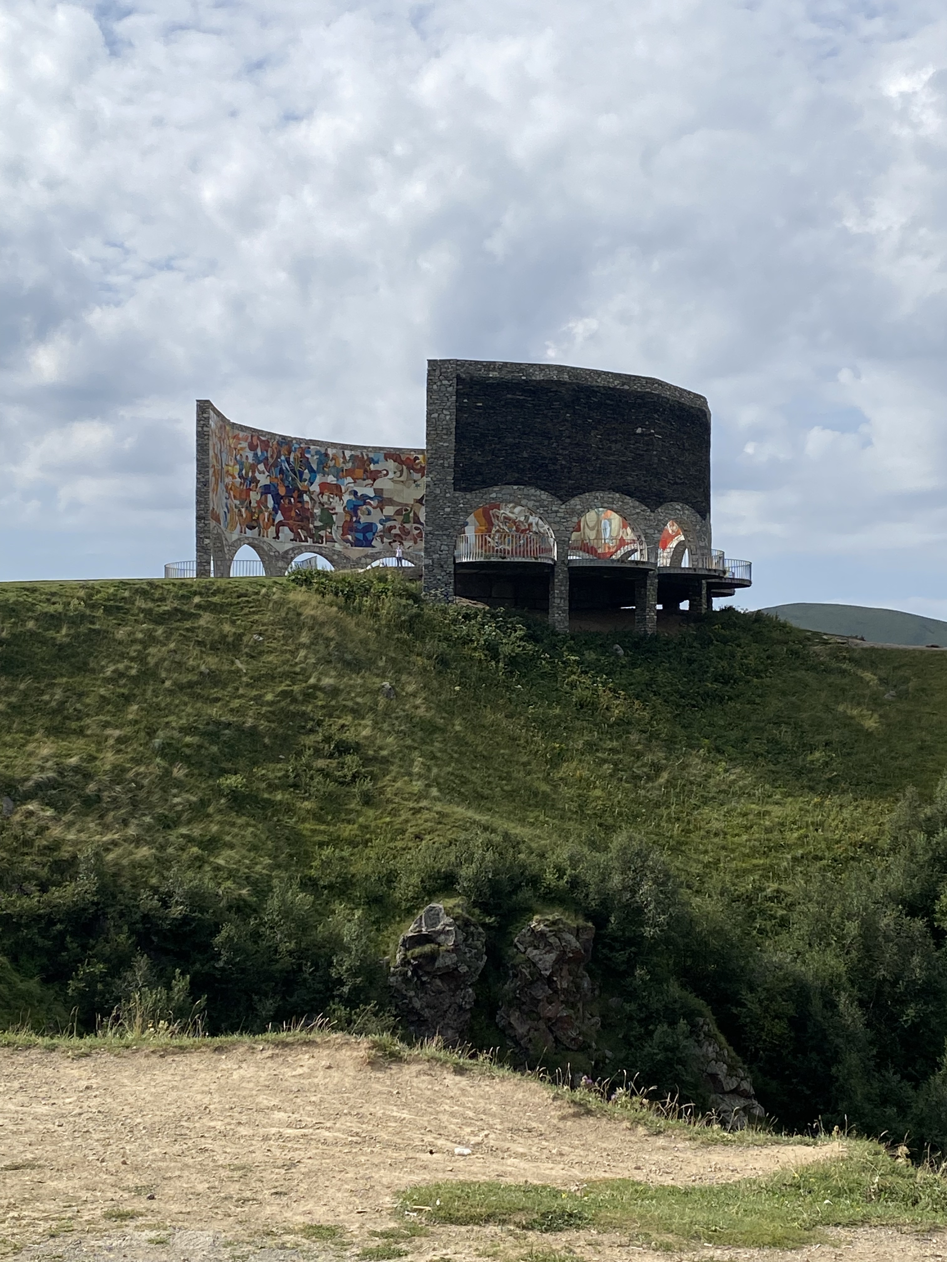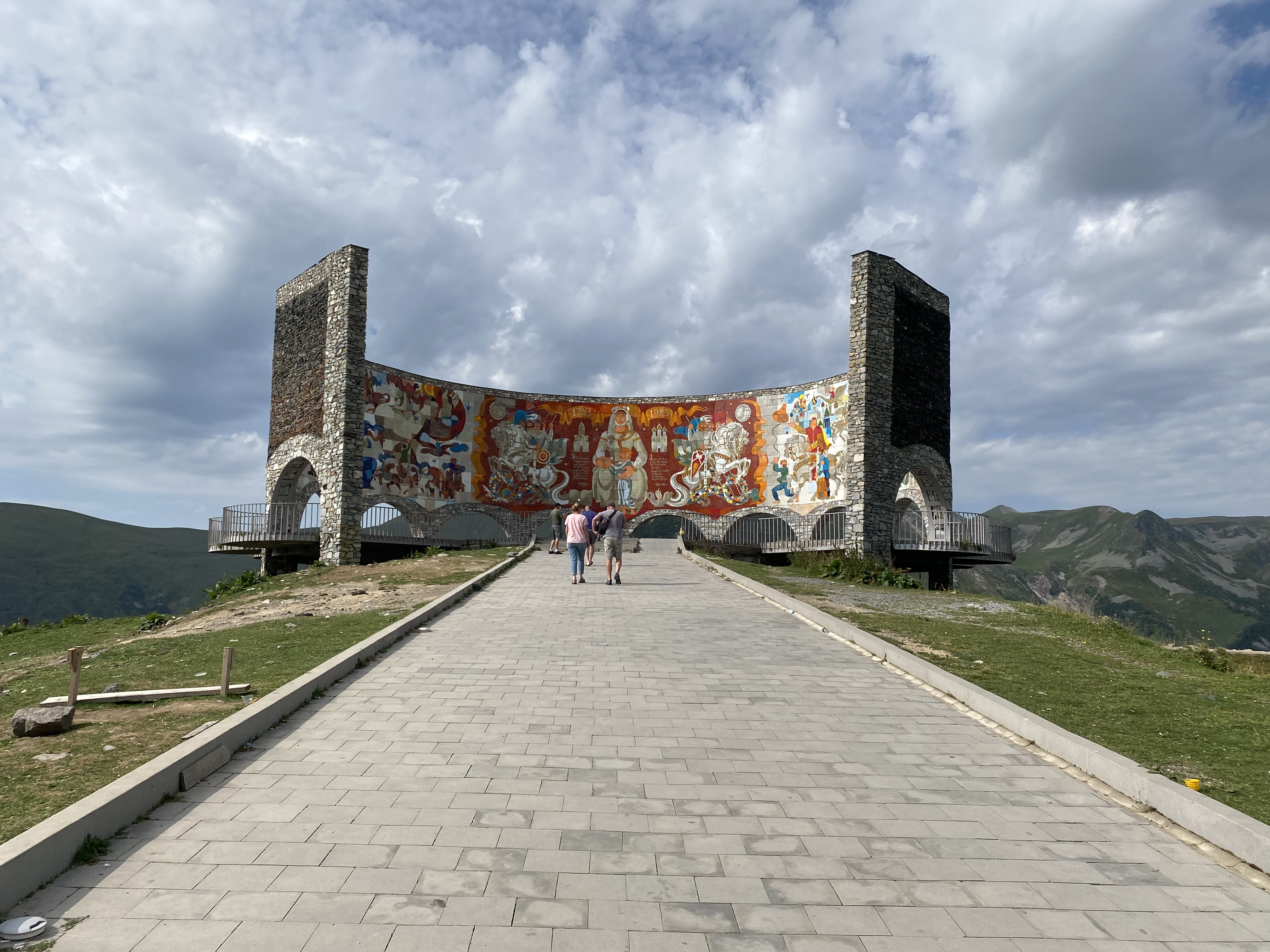 Located on the Georgia Military Highway between the ski resort town of Gudauri and the Jvari pass, the Russia–Georgia Friendship Monument or Treaty of Georgievsk Monument is large round stone and concrete structure overlooking the Devil’s Valley in the Caucasus mountains. Inside the monument is a large tile mural that spans the whole circumference of the structure and depicts scenes of Georgian and Russian history. The monument was built in 1983 to celebrate the bicentennial of the Treaty of Georgievsk and the ongoing “friendship” between Soviet Georgia and Soviet Russia. Our Georgian guide, Sofia was born in 1983 and has survived three wars with the Russians . . . so she is not a fan of the monument! Although she does not support its destruction as some do, she does believe information about the true history between the two countries should be on display.