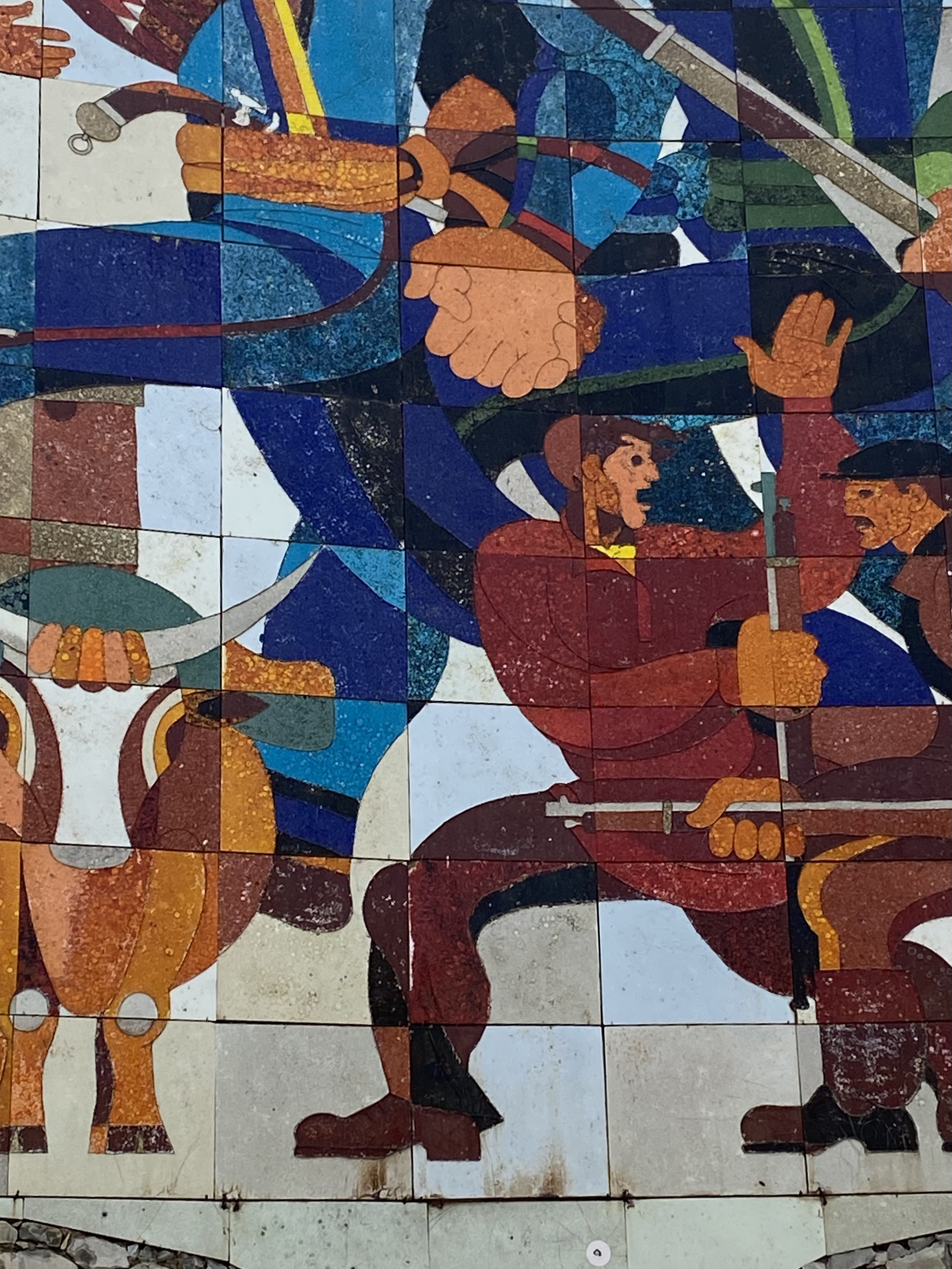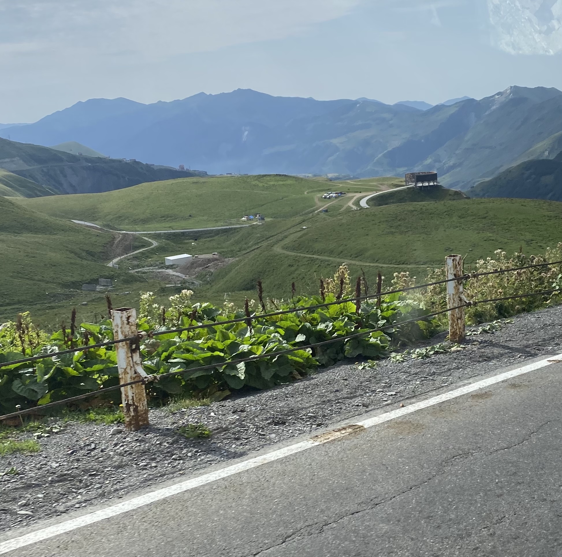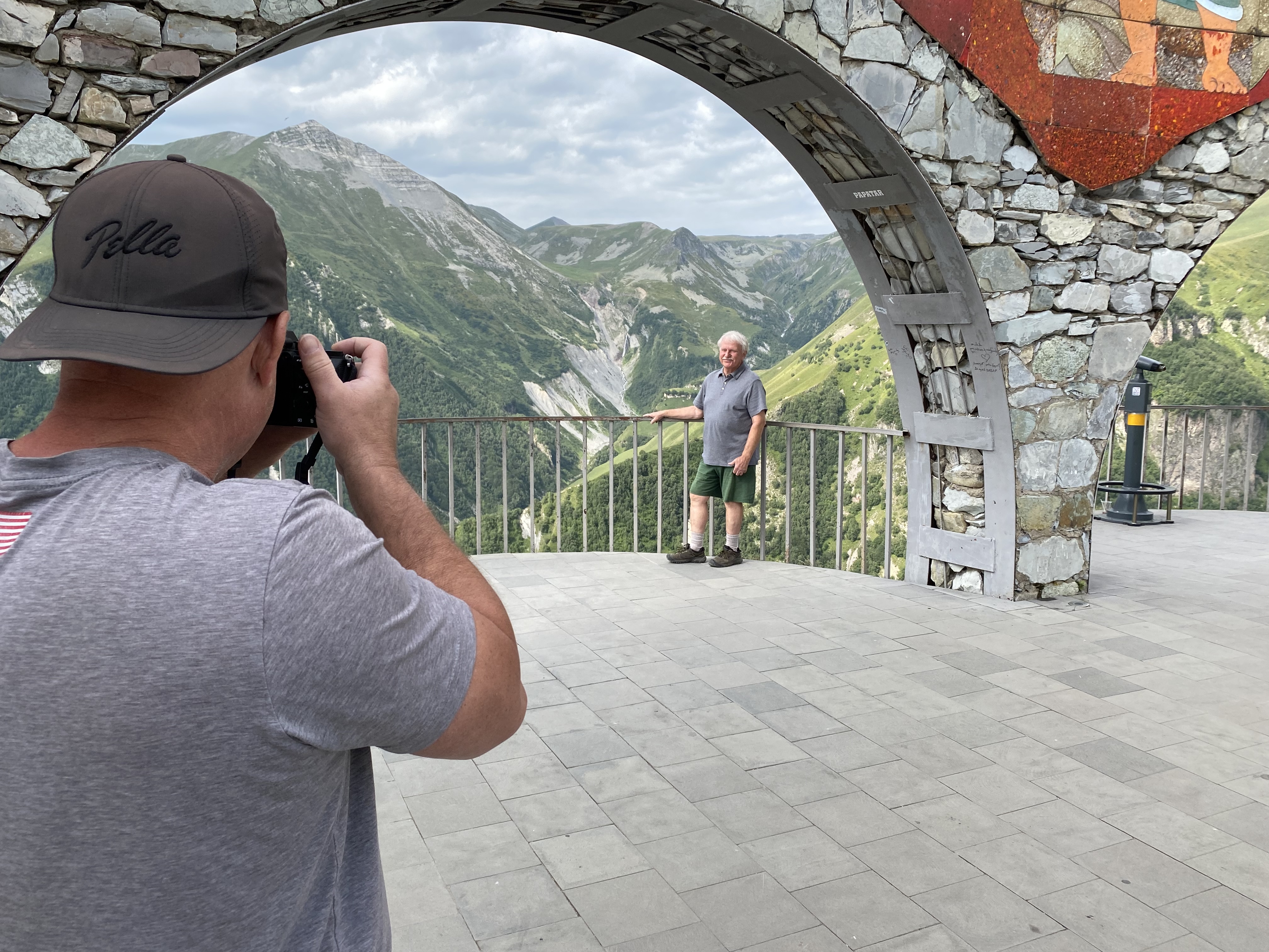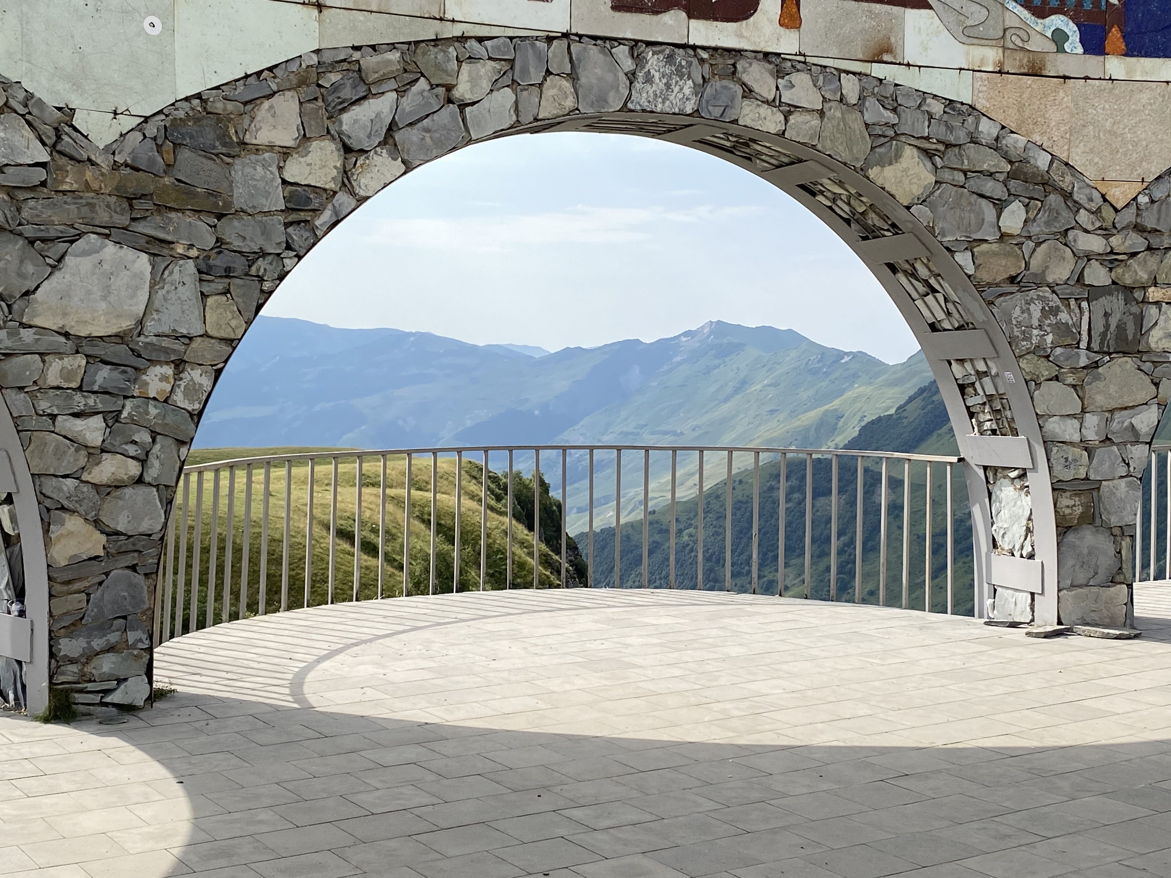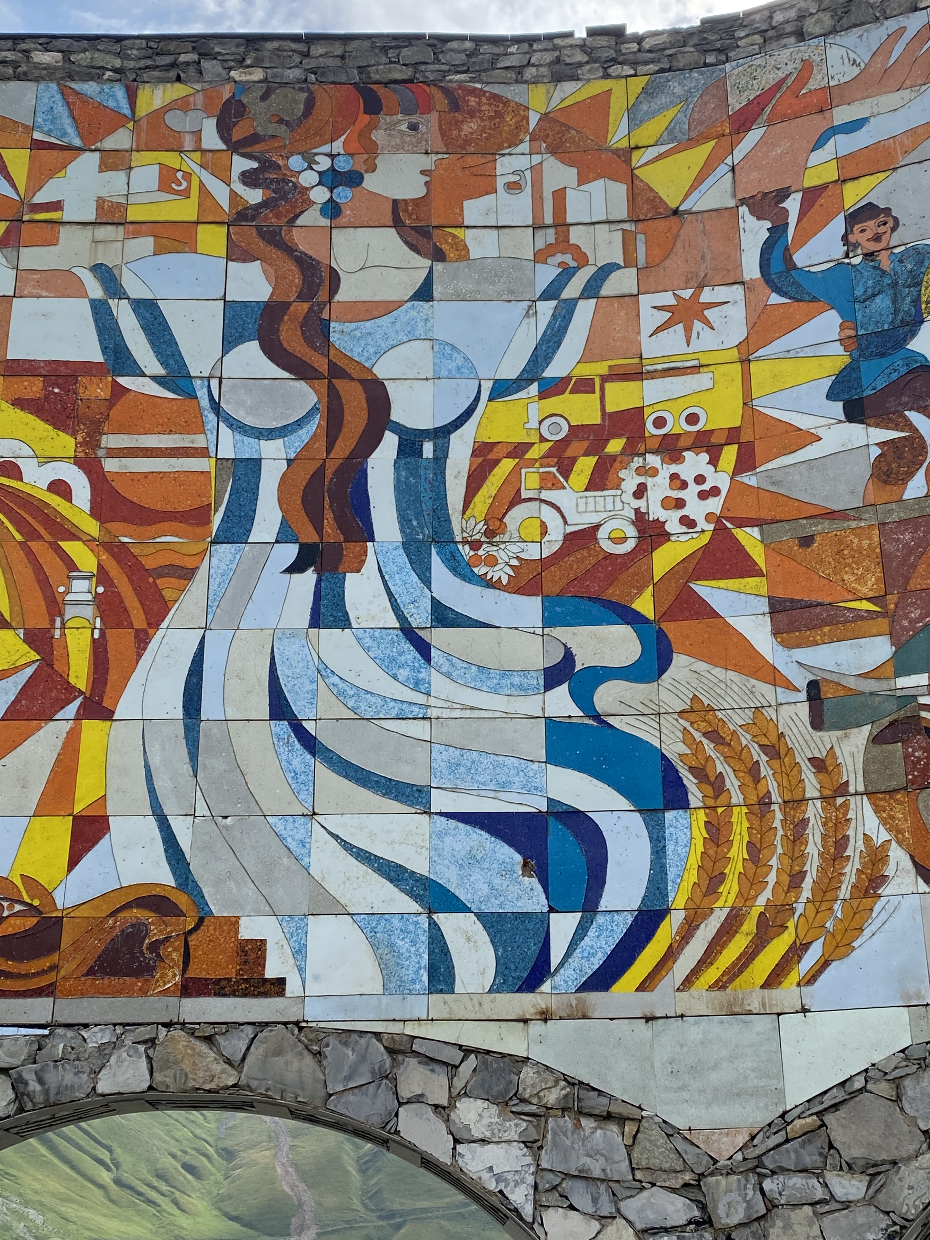 Located on the Georgia Military Highway between the ski resort town of Gudauri and the Jvari pass, the Russia–Georgia Friendship Monument or Treaty of Georgievsk Monument is large round stone and concrete structure overlooking the Devil’s Valley in the Caucasus mountains. Inside the monument is a large tile mural that spans the whole circumference of the structure and depicts scenes of Georgian and Russian history. The monument was built in 1983 to celebrate the bicentennial of the Treaty of Georgievsk and the ongoing “friendship” between Soviet Georgia and Soviet Russia. Our Georgian guide, Sofia was born in 1983 and has survived three wars with the Russians . . . so she is not a fan of the monument! Although she does not support its destruction as some do, she does believe information about the true history between the two countries should be on display.