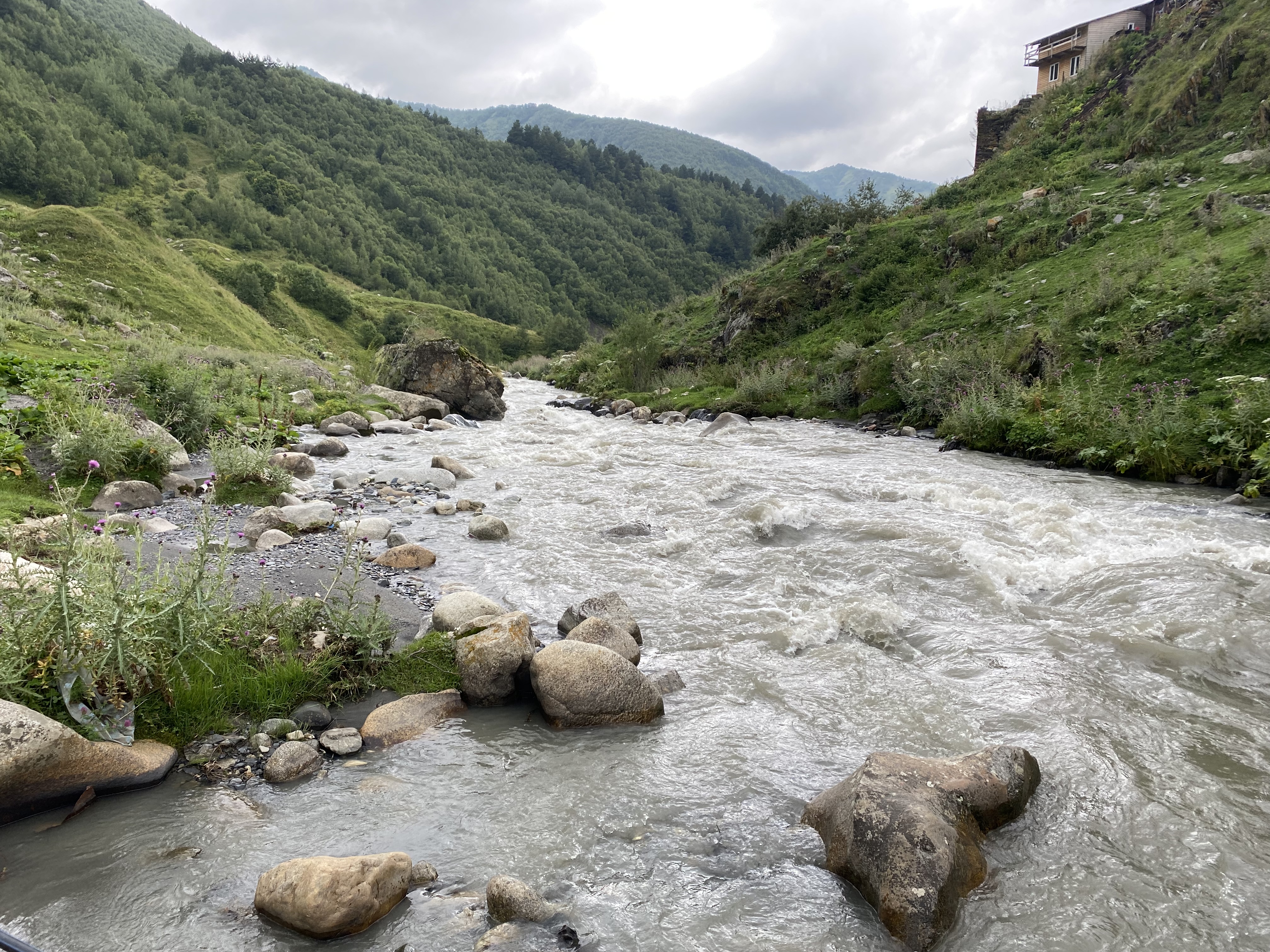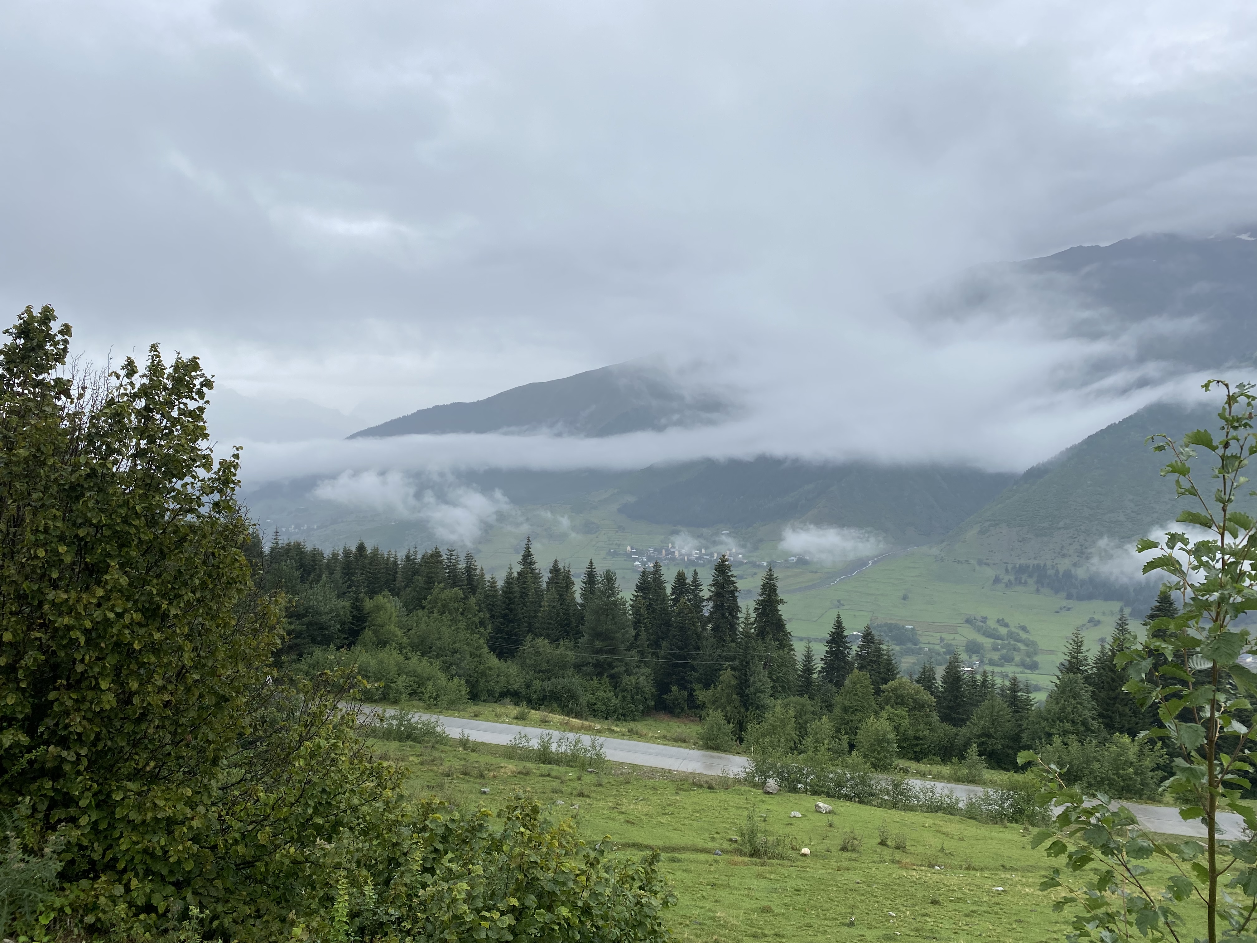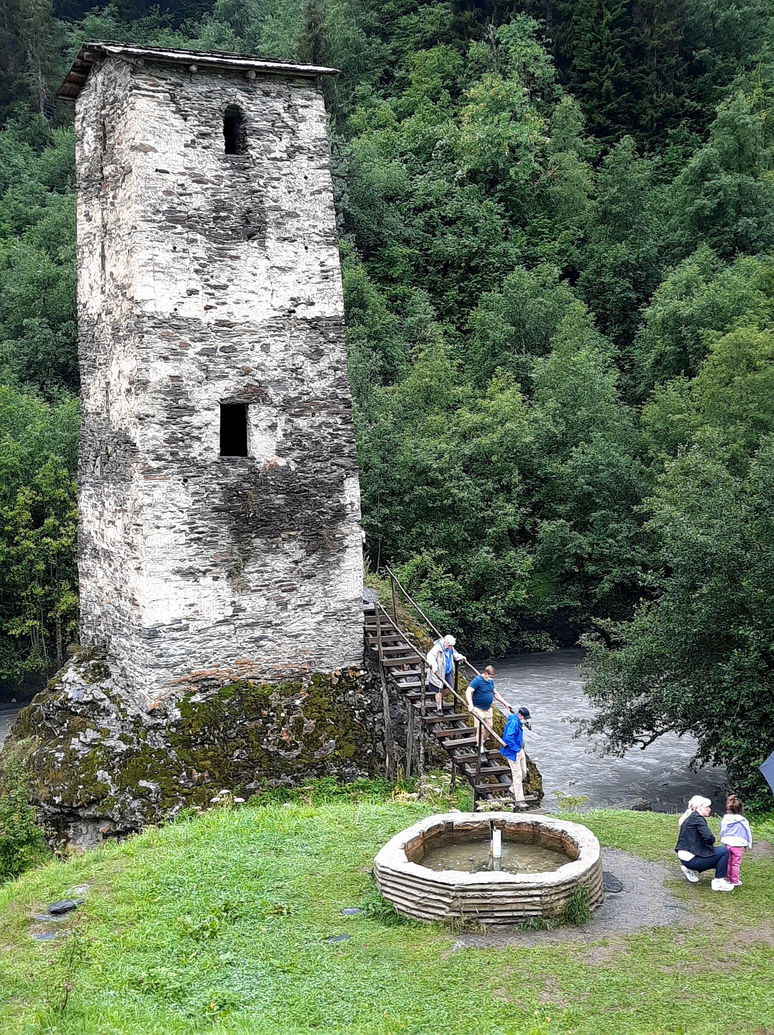 The rain was still forecast at 90% all day, so our guide Sofie switched the agenda to allow us to try for a shorter, less difficult hike today, and the more difficult hike tomorrow . . . “difficult” is a relative term so for me even “less difficult” might give me pause! For today’s destination, two small 4×4 minivans were hired for what could be a wet, muddy trip, particularly if the rain didn’t let up. The steep majestic mountains we drove through were beautiful, with lush green trees and meadows on both sides of the valley. But the raging waters of the Mulkhura River and the continuing rain added an extra level of anxiety to the drive. After an hour and twenty minutes of weaving and maneuvering around water-soaked gullies, mud slides, rock slides, resting cattle, and sink holes in the narrow dirt road, we stopped at an iconic Svan tower, one of many stone structures that can be seen throughout the valley. Ranging from heights of 60’ to 80’ or more, the towers were constructed by each landowner as protection against invaders and physical disasters. When possible, towers were positioned so that a corner faced into the likely path of an avalanche, and history has shown that to be effective. The structures were multi-level and built large enough to house and protect the entire family.