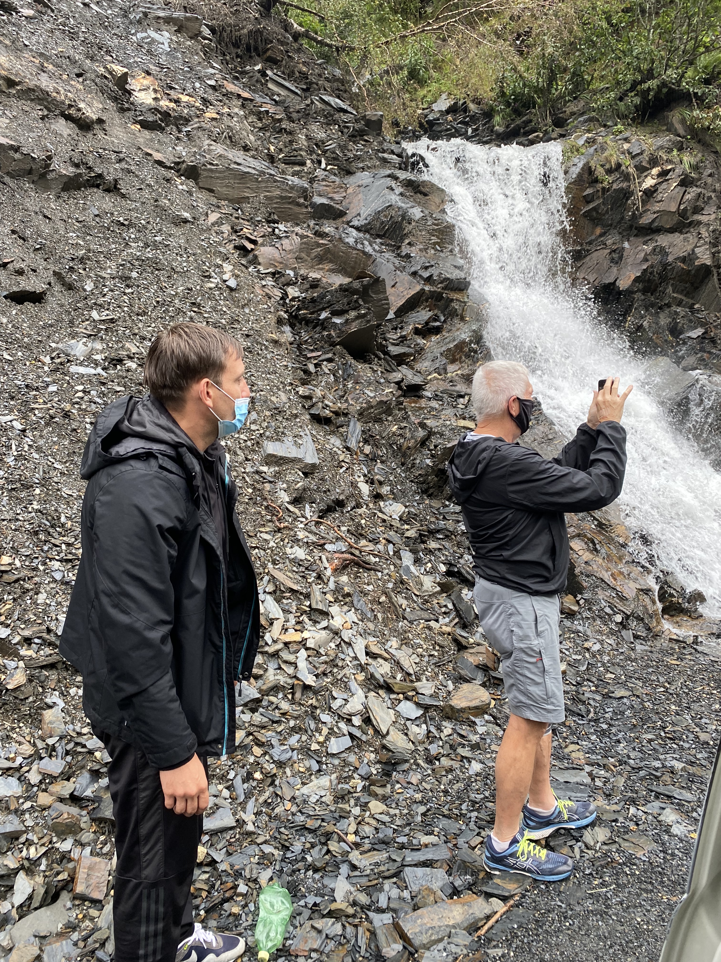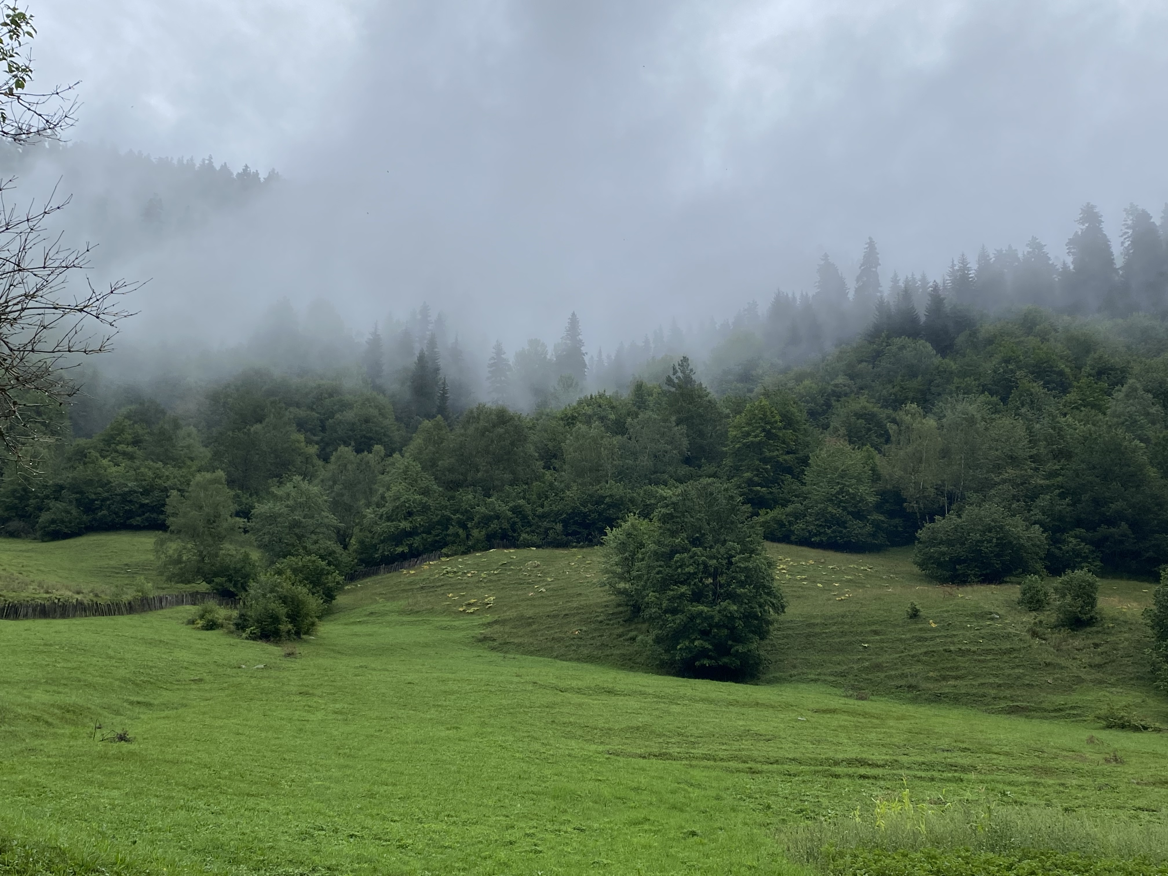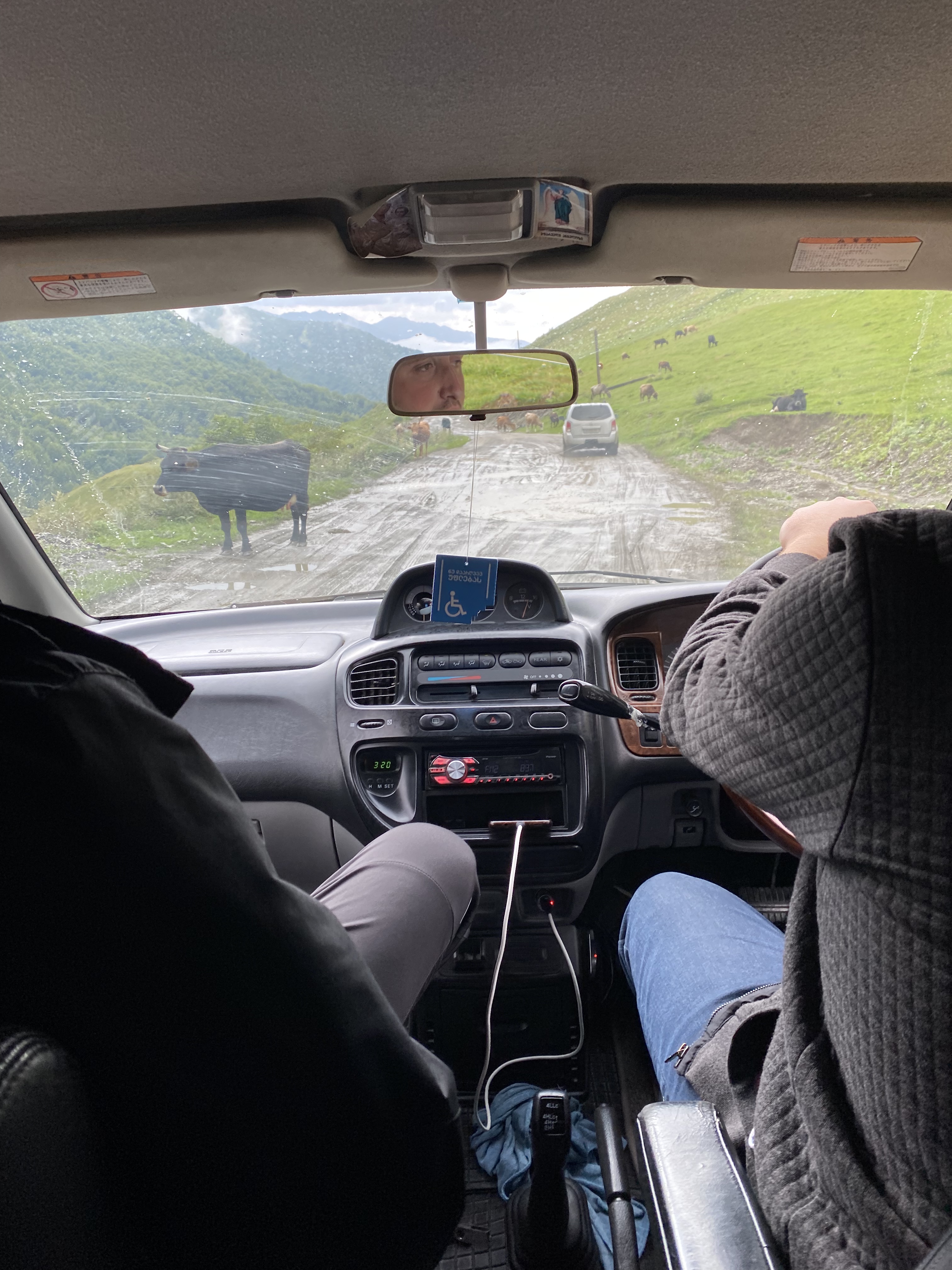 The rain was still forecast at 90% all day, so our guide Sofie switched the agenda to allow us to try for a shorter, less difficult hike today, and the more difficult hike tomorrow . . . “difficult” is a relative term so for me even “less difficult” might give me pause! For today’s destination, two small 4×4 minivans were hired for what could be a wet, muddy trip, particularly if the rain didn’t let up. The steep majestic mountains we drove through were beautiful, with lush green trees and meadows on both sides of the valley. But the raging waters of the Mulkhura River and the continuing rain added an extra level of anxiety to the drive. After an hour and twenty minutes of weaving and maneuvering around water-soaked gullies, mud slides, rock slides, resting cattle, and sink holes in the narrow dirt road, we stopped at an iconic Svan tower, one of many stone structures that can be seen throughout the valley. Ranging from heights of 60’ to 80’ or more, the towers were constructed by each landowner as protection against invaders and physical disasters. When possible, towers were positioned so that a corner faced into the likely path of an avalanche, and history has shown that to be effective. The structures were multi-level and built large enough to house and protect the entire family.