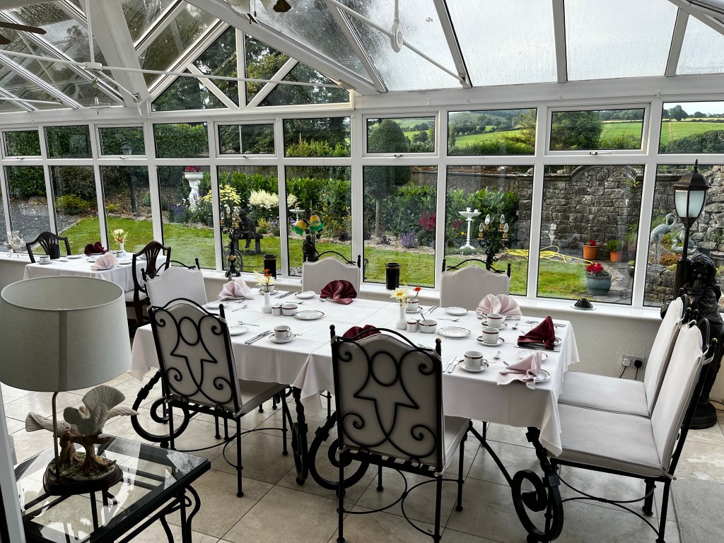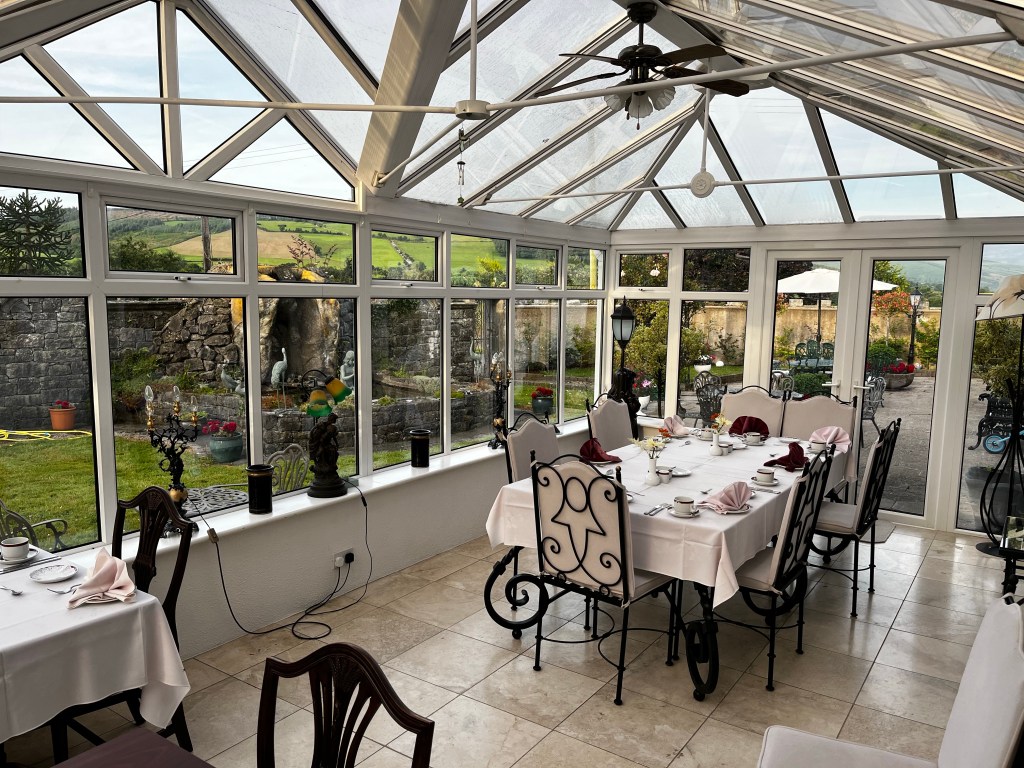 After a refreshing ice cream, we headed to the Glasha Farmhouse, an award-winning bed and breakfast, located in the North Waterford / South Tipperary area, between the Knockmealdown and Comeragh Mountains. The beautiful B&B is an extremely pleasant and comfortable country Inn, with its large living room, and glass-enclosed dining room where an excellent breakfast and dinner was served overlooking the patio and gardens. I was lucky enough to get a room with a 6’ long tub so I took the opportunity to soak in the refreshing hot water before calling it a night.