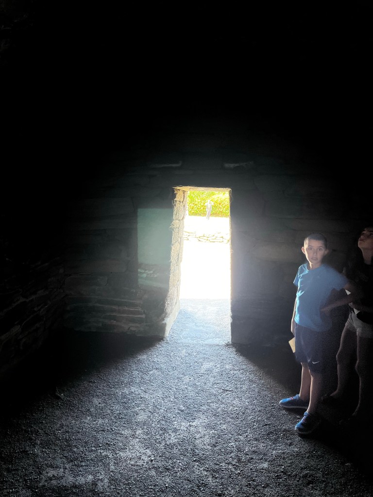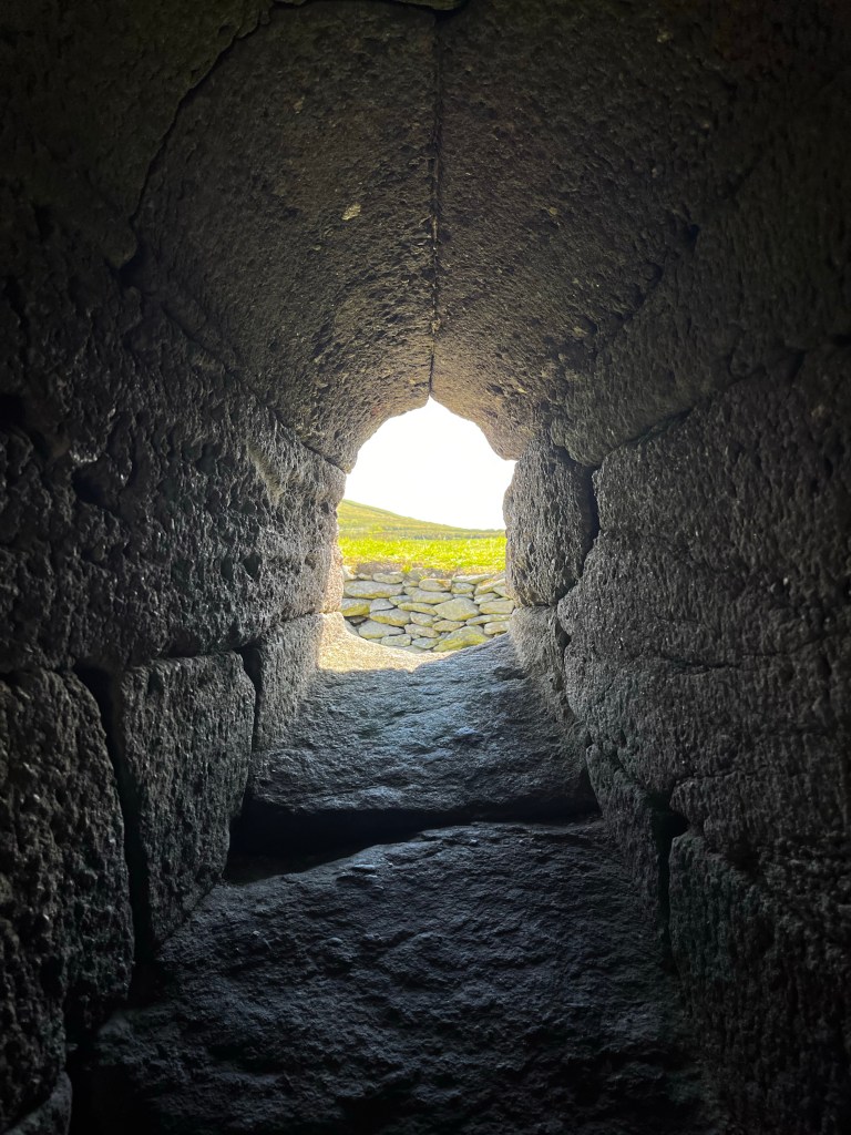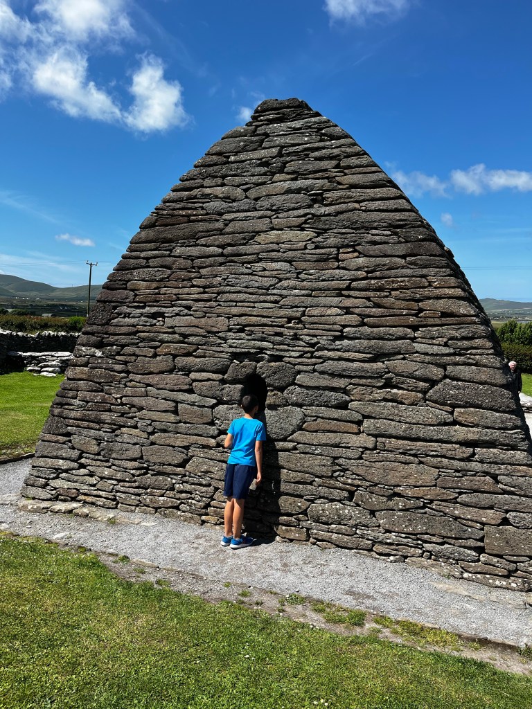We continued our drive along the Slea Head Drive and stopped at the Gallarus Oratory, an archaeological gem nestled in the rugged west coast landscapes. This early Christian site is found on the north shore of the Dingle Peninsula in County Kerry. After watching a 10-minute video of the sites history, we walked up the hill to the unique, secluded stone building. It is about 1300 years old and is a perfect specimen of dry rebel masonry. The building is rectangular and is approximately 8 m long by 5 m wide and 5 m high. The roof is formed by the gradual rise of the sidewalls from the base upwards. The oratory was built by early Christians who loved their trade.